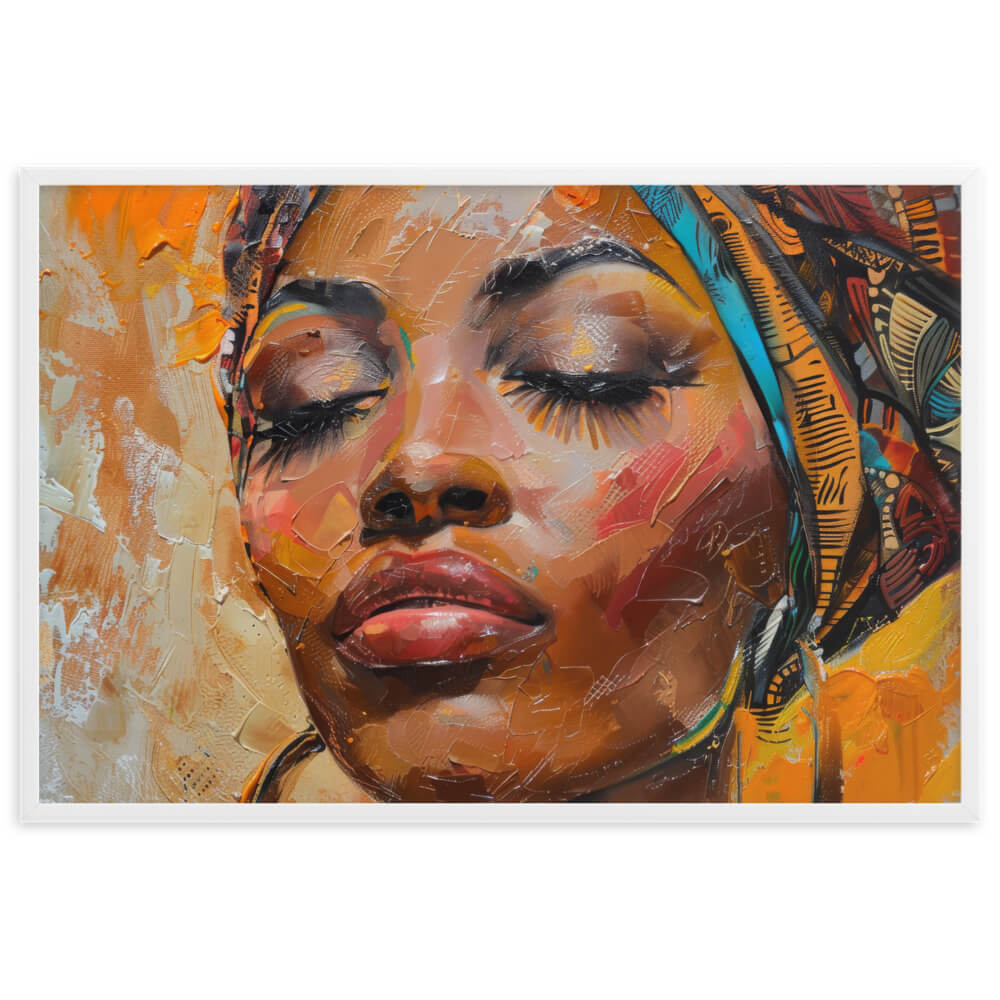 Cet Art Africain représente la Peinture d'une Femme ornée d'un ruban. Son magnifique visage transmettra une émotion unique à votre décoration d'intérieur.