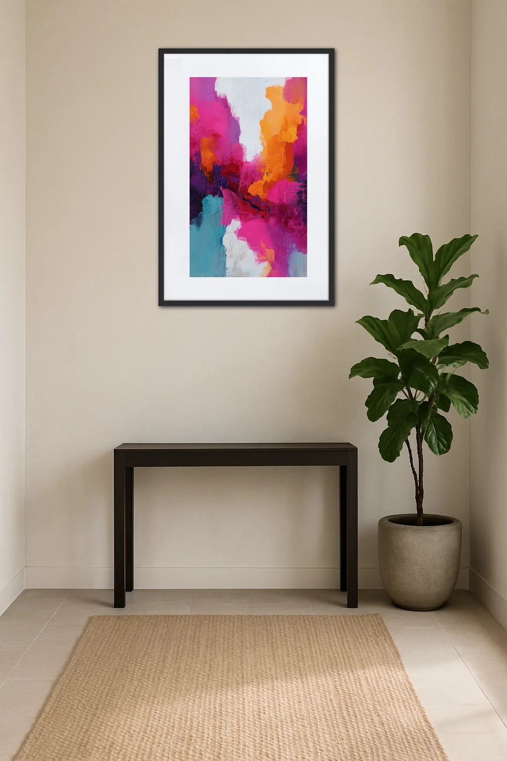 Ce tableau abstrait, aux teintes éclatantes et à la matière généreuse, raconte une histoire de contrastes et de rencontres inattendues. Il évoque une confrontation harmonieuse entre des forces opposées, où le rose profond dialogue avec l’orange flamboyant, tandis que des touches de bleu apportent une fraîcheur apaisante. Au-delà de l’apparente spontanéité des formes, se dessine une composition qui interroge l’équilibre entre chaos et ordre, entre nature et émotion. Ce travail est une invitation à ressentir le mouvement, à percevoir la richesse des sensations à travers chaque nuance et chaque relief. L’œuvre s’inscrit dans une tradition contemporaine qui détourne l’iconographie classique pour réinventer un langage visuel vibrant, capable de toucher l’âme. Elle invite ainsi le spectateur à une immersion où le regard se perd dans des profondeurs colorées, où la lumière semble jaillir de la toile elle-même. Ce tableau ne se contente pas d’habiller un mur, il crée une atmosphère, une présence vivante qui stimule l’imaginaire et la réflexion, faisant de chaque instant un moment d’émerveillement renouvelé.