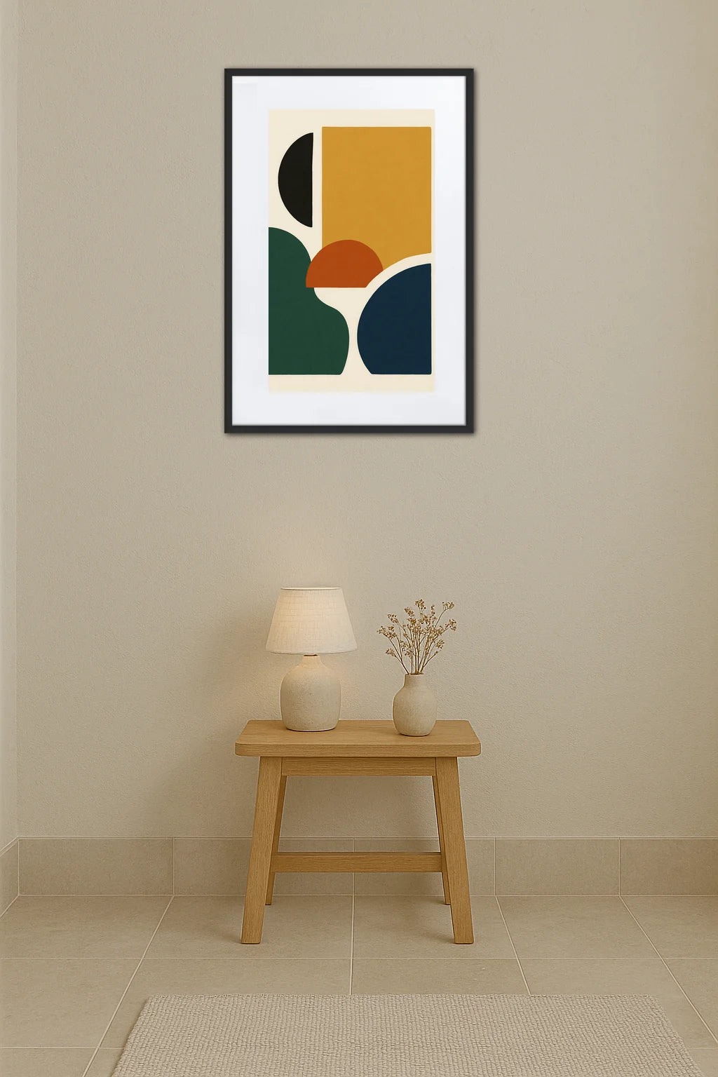 Cette composition abstraite transcende la simple décoration pour devenir un véritable dialogue entre espace et émotions. Les formes arrondies et anguleuses s’entrelacent avec une élégance maîtrisée, créant un univers où chaque couleur raconte une histoire. Le grand rectangle ocre évoque la chaleur d’un coucher de soleil, tandis que les cercles et demi-cercles aux teintes profondes suggèrent des éléments naturels détournés, comme des collines ou des éclats de lumière filtrée. Le contraste entre les espaces pleins et vides invite à une respiration mentale, donnant à l'œil la liberté de vagabonder et de composer son propre récit. Plus qu’une simple abstraction, ce tableau se fait miroir des sensations et des souvenirs enfouis, un refuge visuel qui stimule autant l’esprit que le cœur. Par son esthétique épurée et ses lignes claires, il s’inscrit dans une tradition moderne tout en laissant une place à l’imaginaire, dans un équilibre parfait entre rigueur et liberté créative.