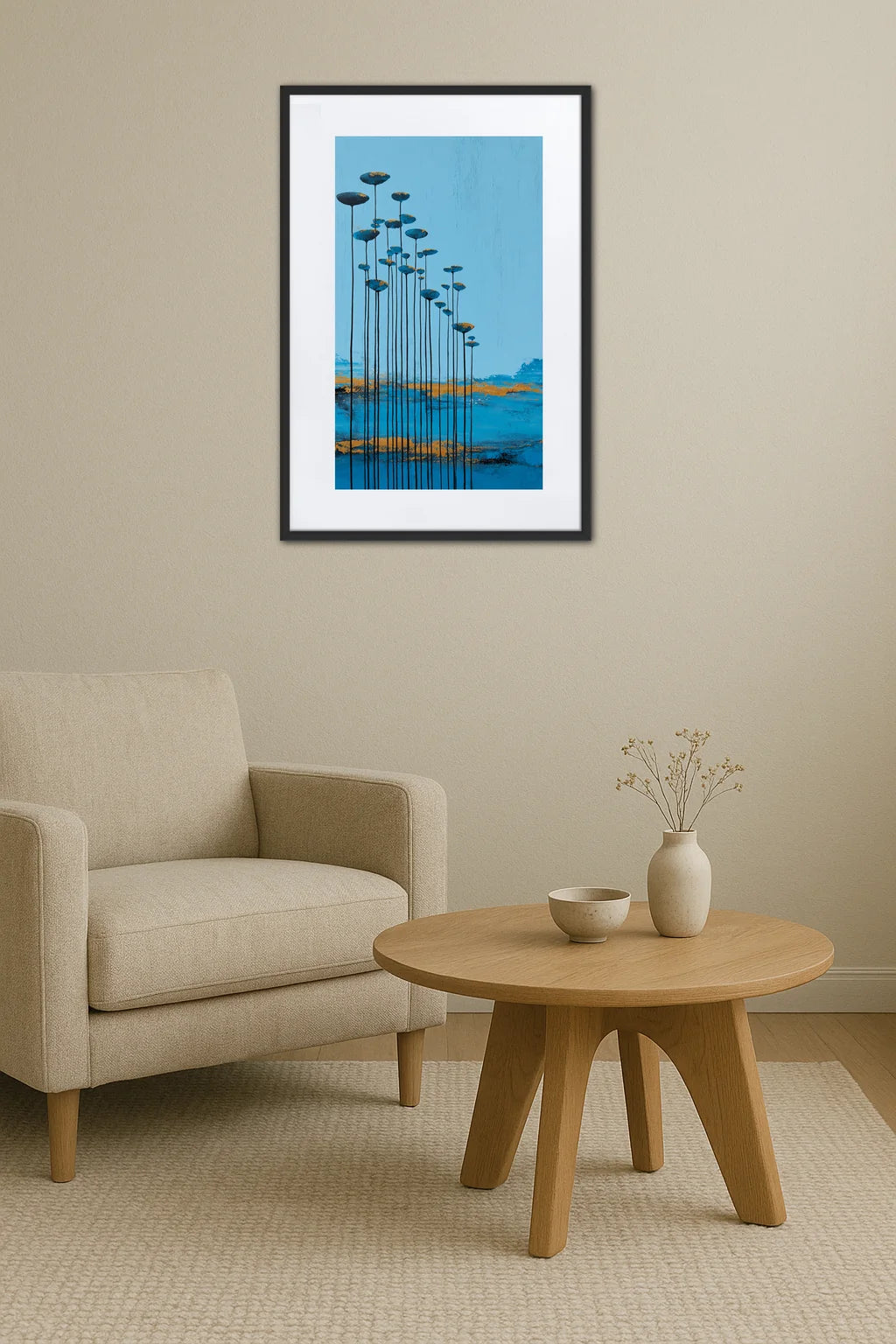 Cette œuvre incarne un dialogue entre la simplicité des formes et la profondeur des émotions qu’elles suscitent. Les silhouettes élancées, presque flottantes, évoquent une nature réinventée où les frontières entre le réel et l’imaginaire s’effacent. Chaque tige fine, comme un fil de soie, s’élève vers un ciel doux, suggérant la quête d’un équilibre fragile entre la légèreté et la solidité. Le choix des nuances, mêlant des teintes d’azur profond et des touches chaleureuses, invite à ressentir la sérénité d’un instant suspendu, où le temps ralentit et où l’esprit s’ouvre à une rêverie infinie. Plus qu’une simple représentation, ce tableau est un poème visuel, une métaphore de nos aspirations à échapper au tumulte quotidien pour toucher une forme de pureté et de calme intérieur. Il dialogue avec la culture contemporaine en revisitant le motif floral sous un prisme abstrait, offrant une nouvelle lecture à la nature, à la fois familière et inattendue. Le cadre épuré souligne la modernité de cette création, faisant de chaque regard une expérience unique, où l’art devient un refuge et une source d’inspiration.