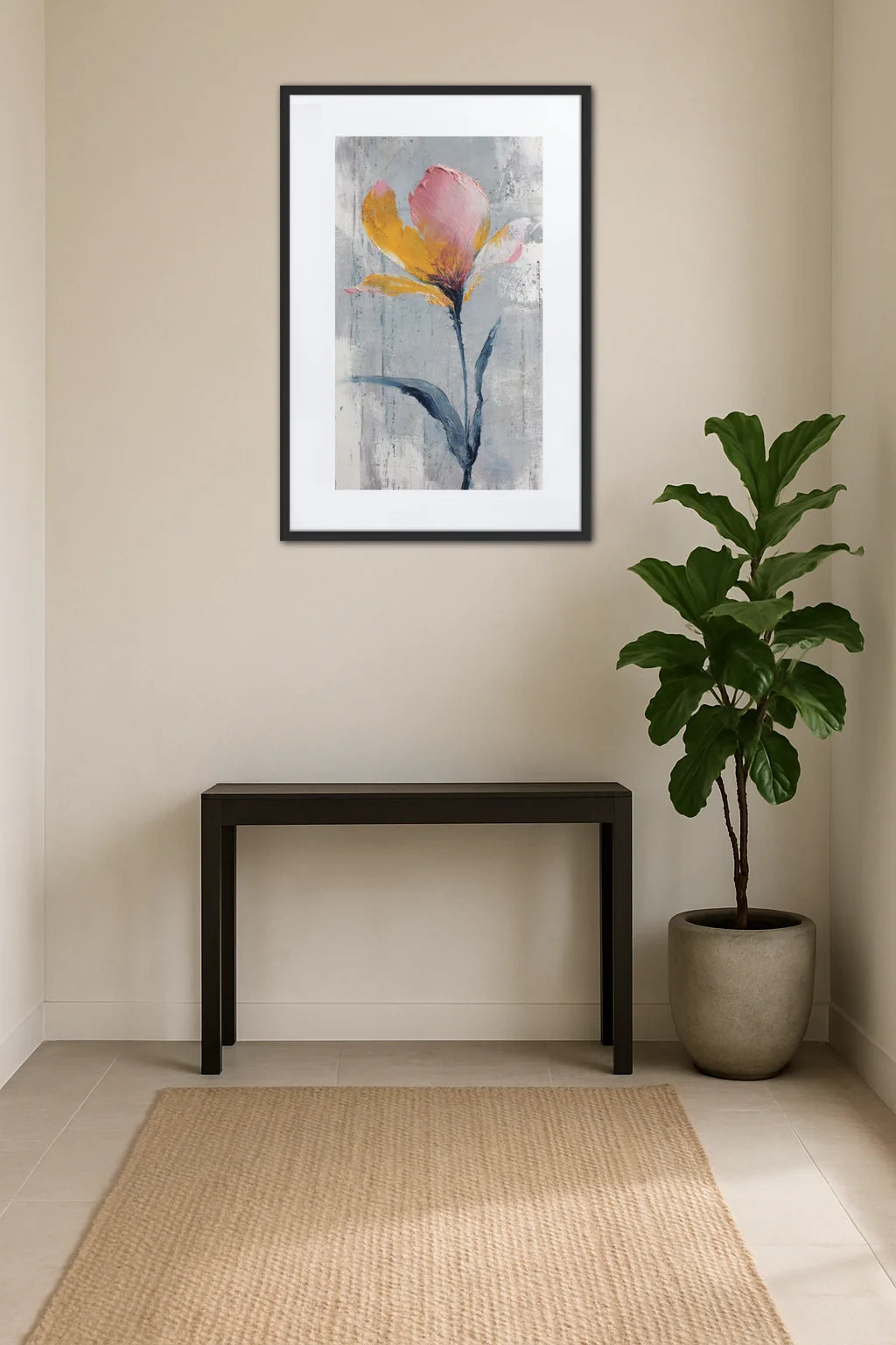 Ce tableau abstrait fleurs incarne une rencontre entre la sensibilité humaine et la puissance évocatrice de la nature réinventée. L’artiste s’est affranchi des formes traditionnelles pour offrir une vision où la fleur, dans ses contours à peine esquissés, devient un souffle d’énergie et d’espoir. Le fond, aux nuances subtiles de gris et de blanc, rappelle les textures du béton urbain ou les brumes d’un matin calme, contrastant avec la vivacité des pétales ocre et rose. Cette opposition entre le doux et le rugueux, le naturel et l’artificiel, invite à une réflexion sur la coexistence des contraires dans nos vies modernes. Plus qu’une simple représentation florale, cette œuvre évoque l’éphémère et la résilience, la fragilité et la force, posant un regard contemporain sur un motif éternel. En s’éloignant du réalisme, elle capte une émotion fugace, presque une sensation, celle d’un instant suspendu entre rêve et réalité. Elle parle à ceux qui aiment que leur intérieur raconte une histoire, une émotion prête à s’épanouir chaque jour sous leurs yeux.