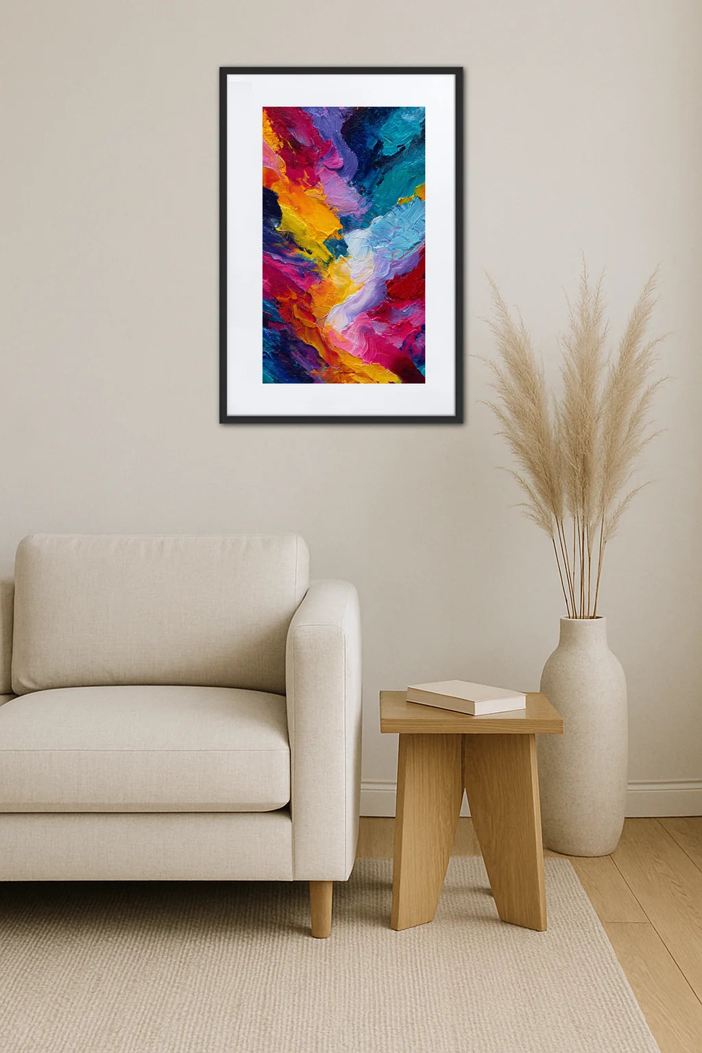 Pour prolonger cette aventure colorée, découvrez le charme épuré du Tableau Abstrait Gris Beige, un compagnon idéal qui dialogue avec subtilité au sein de la même collection.