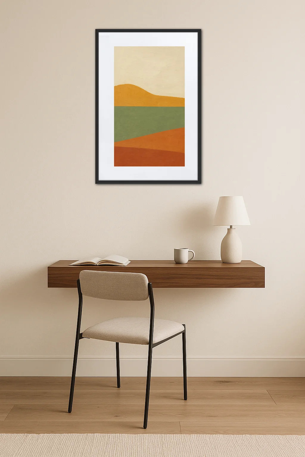 Ce tableau abstrait grand format incarne une vision apaisante, où les formes simples se déploient avec élégance pour évoquer un paysage intérieur. Les aplats chaleureux et les lignes minimalistes invitent au voyage au cœur d’un horizon lointain, teinté d’une douceur méditative. La puissance tranquille des volumes, associée à la douceur des nuances, crée un dialogue subtil entre espace et matière. Cette œuvre puise son inspiration dans la simplicité des paysages naturels, transformés en symboles visuels qui parlent à notre sensibilité. Elle célèbre la beauté de la sobriété et l’essence même de l’expression artistique, où chaque couleur et chaque forme deviennent une respiration. Dans un monde souvent agité, ce tableau propose un refuge, une pause contemplative qui invite à retrouver calme et équilibre. Par sa composition soigneusement équilibrée, il évoque un sentiment de stabilité et de sérénité, offrant à la fois une présence forte et une délicatesse discrète. Plus qu’un simple décor, il devient un compagnon silencieux, porteur d’émotions et de pensées, qui transcende le quotidien par sa pureté esthétique et sa profondeur intime.