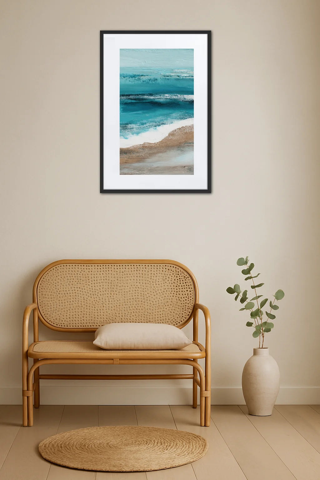 Cette œuvre, inspirée par la poésie mouvante des rivages et le bruissement secret des flots, évoque un voyage intérieur où la mer devient métaphore d’émotions profondes et changeantes. Les nuances choisies, délicates et puissantes à la fois, traduisent le dialogue entre le ciel et l’eau, entre la lumière et l’ombre, créant un espace où le regard se perd et se trouve à la fois. On y ressent la force tranquille de l’océan mais aussi son mystère, son appel à la contemplation et à la rêverie. Cette création s’inscrit dans une tradition contemporaine où l’abstraction n’est pas une fuite mais une invitation à ressentir plutôt qu’à comprendre. La texture, presque tactile, suggère la sensation du vent et du sable, tandis que les contrastes évoquent la dynamique incessante des marées. Plus qu’une simple représentation, ce tableau devient une expérience sensorielle et émotionnelle, un instant suspendu entre la réalité et l’imaginaire, où chaque nuance raconte une histoire différente selon l’angle du regard. Il incarne cette quête universelle d’harmonie et de liberté, portée par l’image intemporelle de la mer.