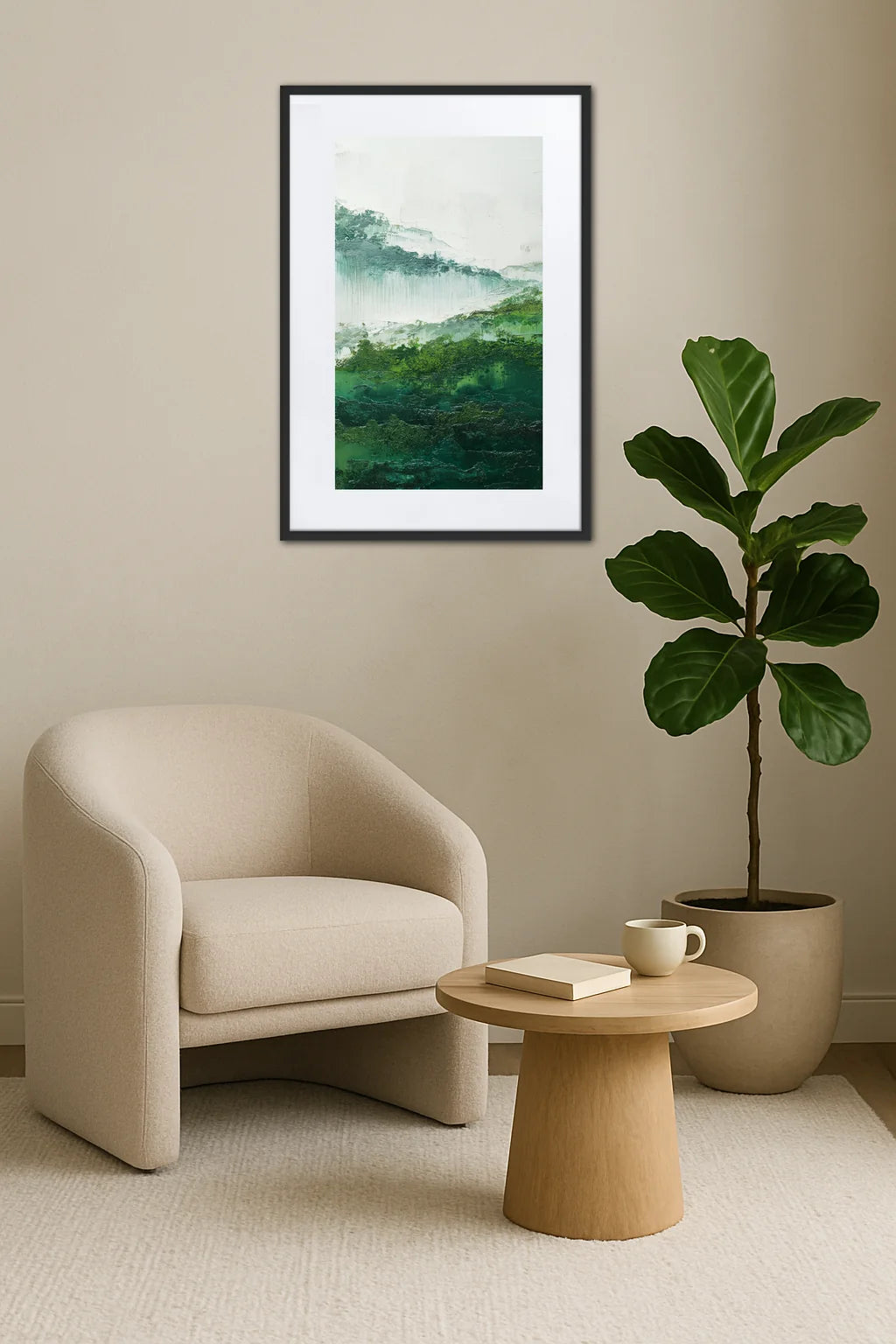 - Profondeur visuelle : Les différentes intensités de vert créent un effet de relief qui attire le regard et invite à l’exploration. Cette immersion visuelle procure un apaisement immédiat, comme une promenade intérieure au cœur d’un paysage secret.