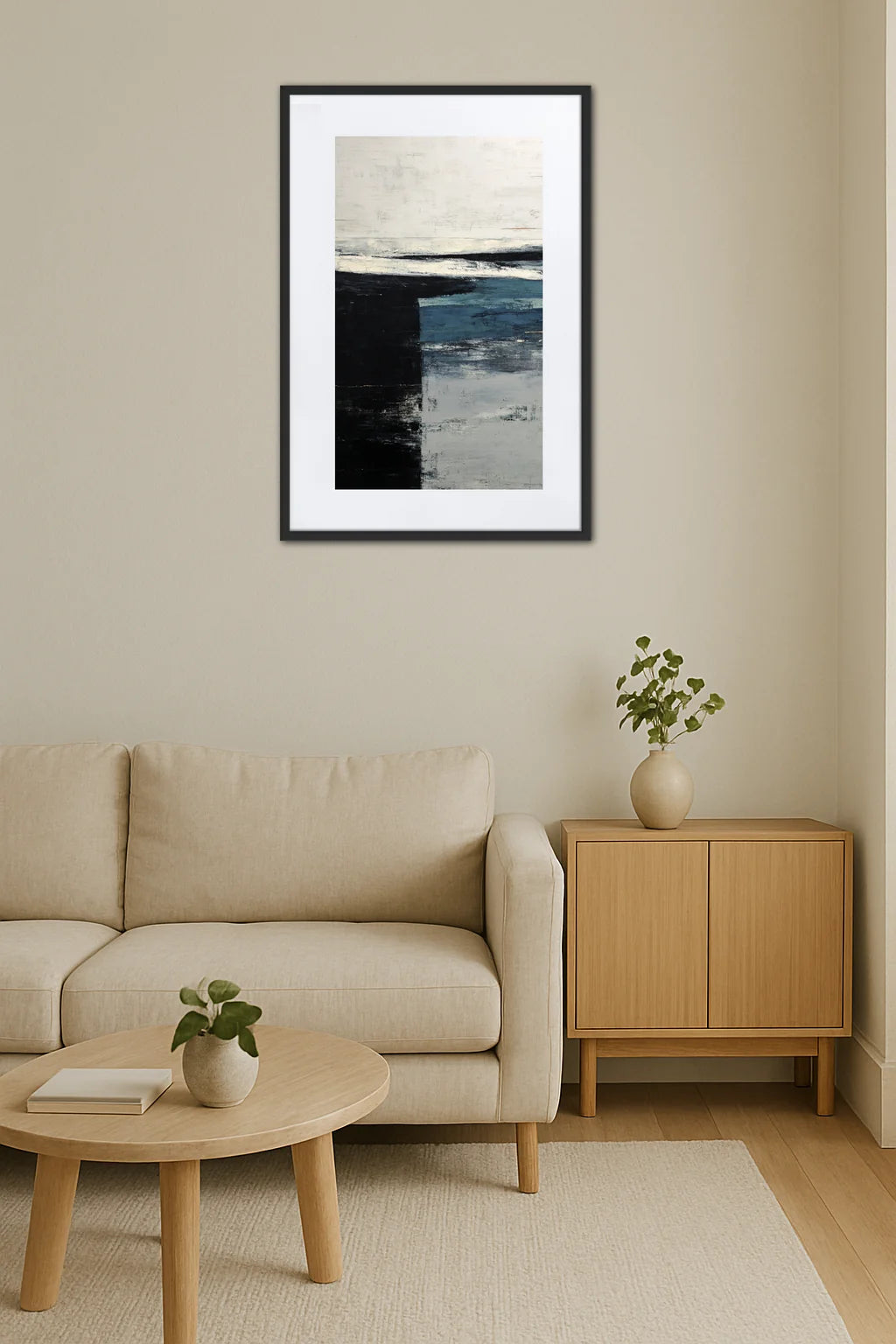 - Ambiance intemporelle : Le choix des formes épurées et des contrastes simples confère à l’œuvre une élégance discrète. Elle devient alors un refuge où le spectateur trouve sérénité et inspiration, un espace propice à la rêverie.