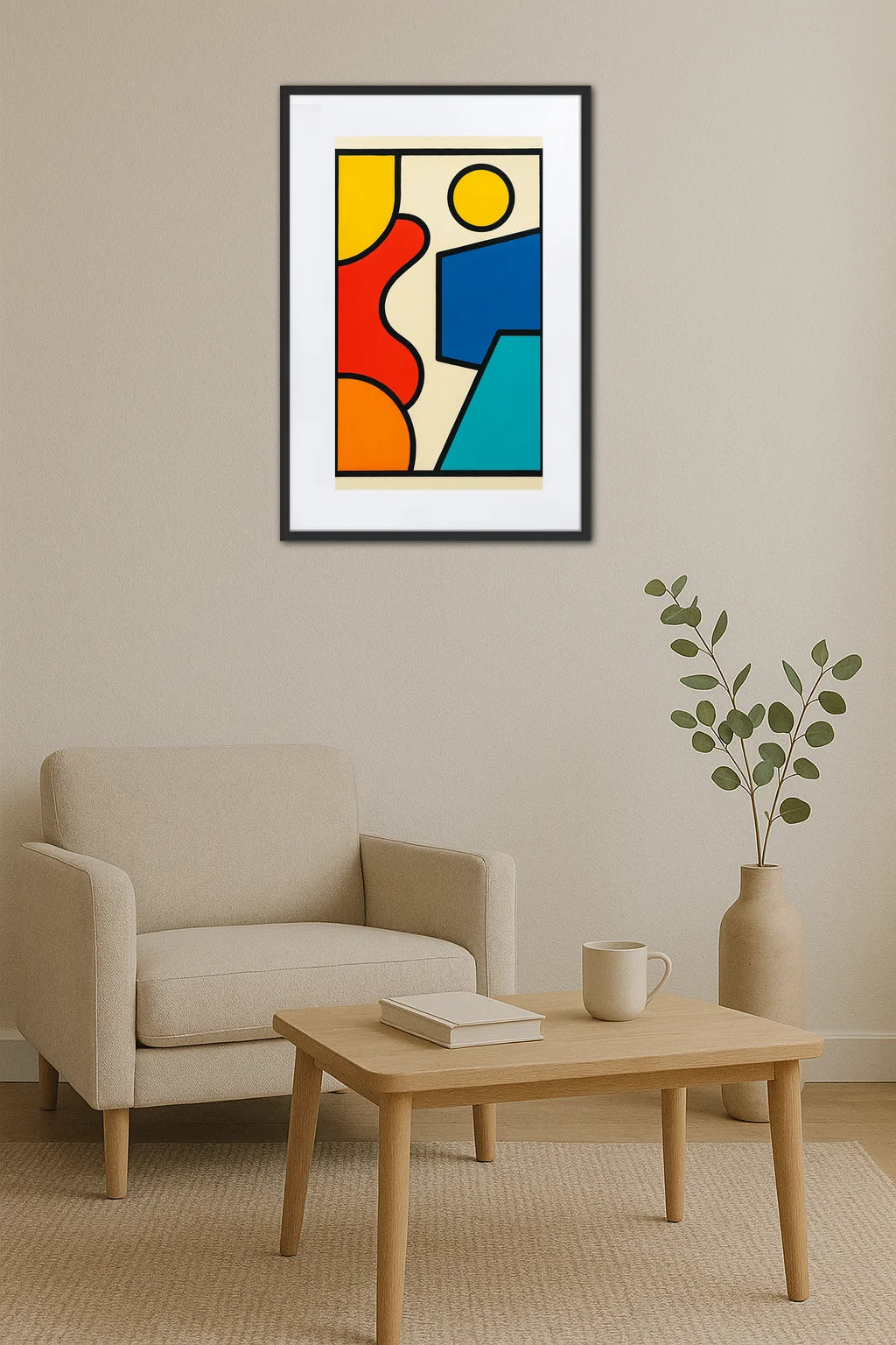 Ce tableau abstrait pop art puise son inspiration dans la rencontre entre l’expression libre et la rigueur des formes géométriques. Il évoque une célébration joyeuse des contrastes visuels, où des aplats généreux de couleurs franches s’entrelacent avec des contours noirs précis, rappelant la force du trait dans l’art graphique. Chaque élément semble raconter une histoire, oscillant entre le familier et l’inattendu, comme un clin d’œil à la culture populaire revisitée à travers un prisme contemporain. L’œuvre incarne un moment suspendu, où la simplicité apparente cache une profondeur émotionnelle riche. Ce dialogue entre abstraction et figuration, entre éclat et équilibre, invite à une expérience sensorielle unique. Plus qu’une décoration, ce tableau devient un espace de réflexion et d’évasion, une invitation à ressentir la vitalité du monde à travers les formes et leurs harmonies vibrantes. Il reflète aussi une époque où l’art s’affranchit des conventions pour s’imposer avec légèreté et force, un hommage à la créativité débridée qui transcende les limites traditionnelles.