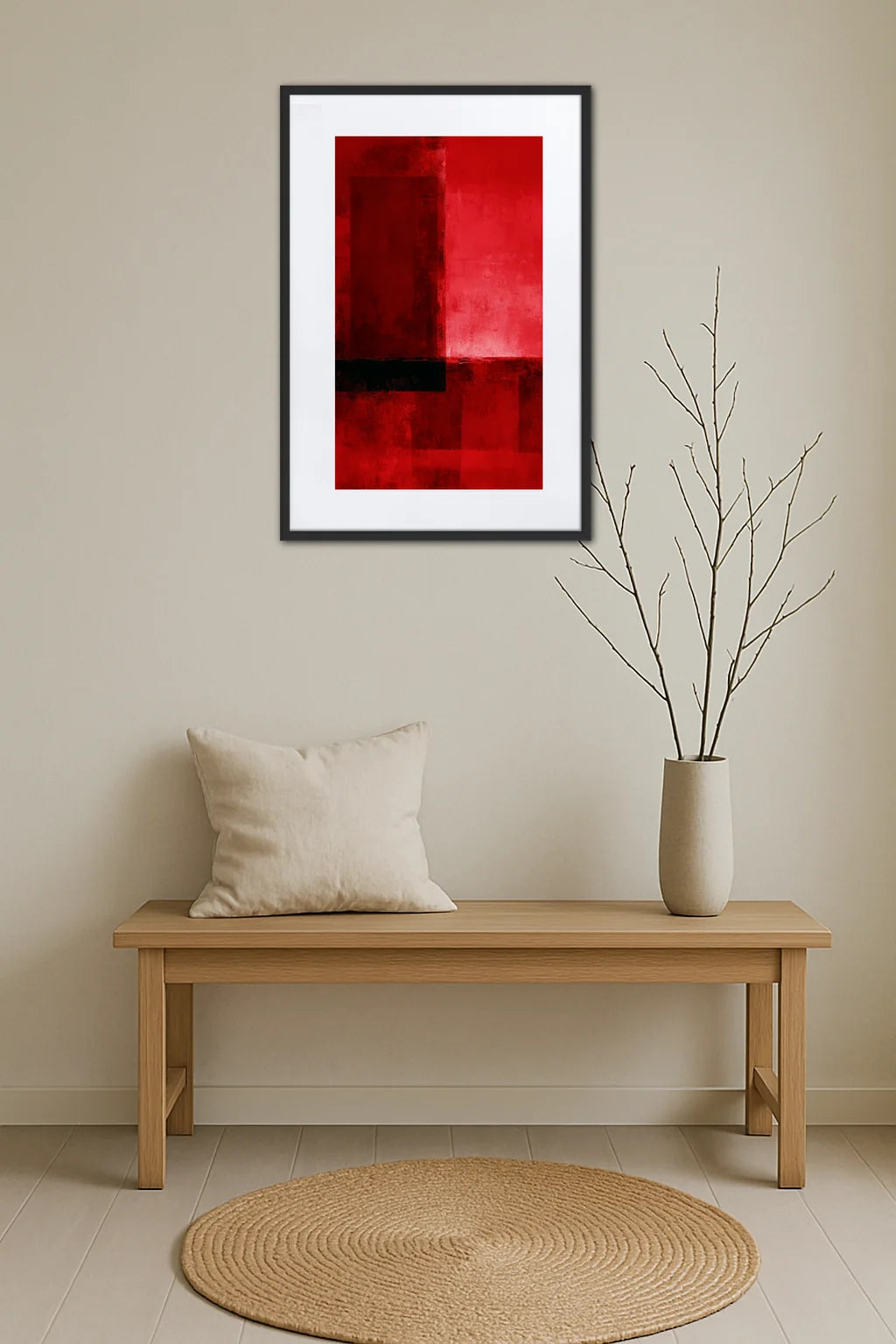 - Impact visuel fort : Les nuances profondes de rouge captivent immédiatement le regard, offrant une présence vibrante qui dynamise l’espace. Cette intensité chromatique déclenche une émotion vive, éveillant un sentiment d’énergie et de vitalité dans la pièce.