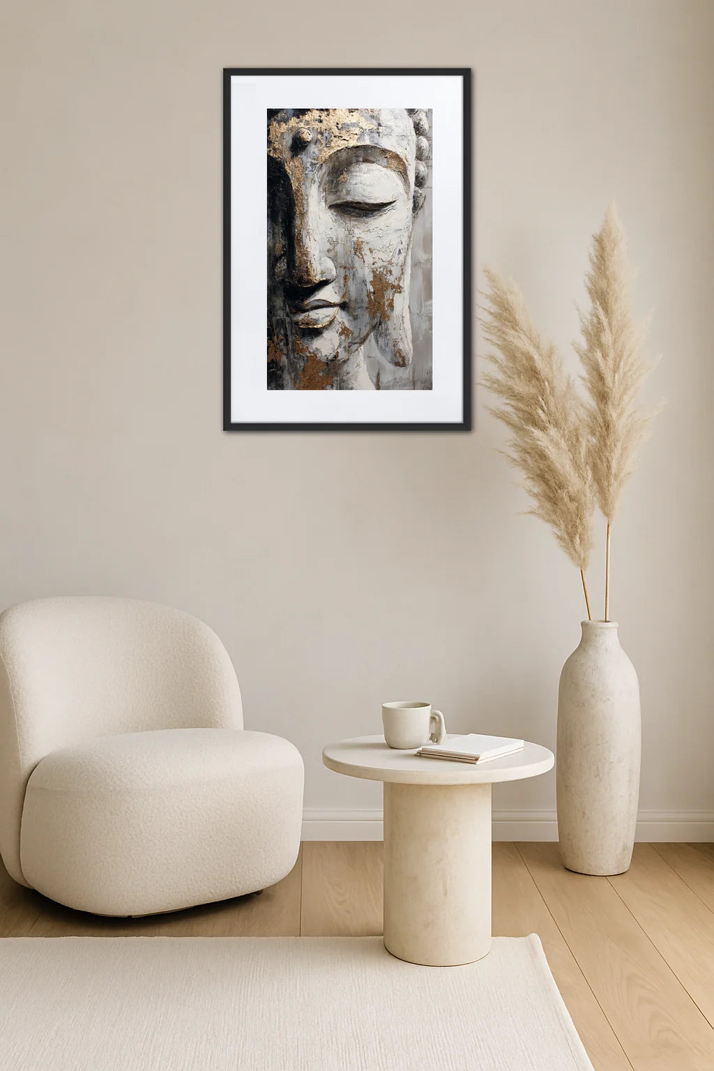 - Invitation à la méditation : Le visage serein évoque une forme de sagesse intemporelle, offrant un point d’ancrage pour la réflexion. Cette rencontre visuelle suscite un apaisement profond, transformant l’espace en un lieu de recueillement et de contemplation.
