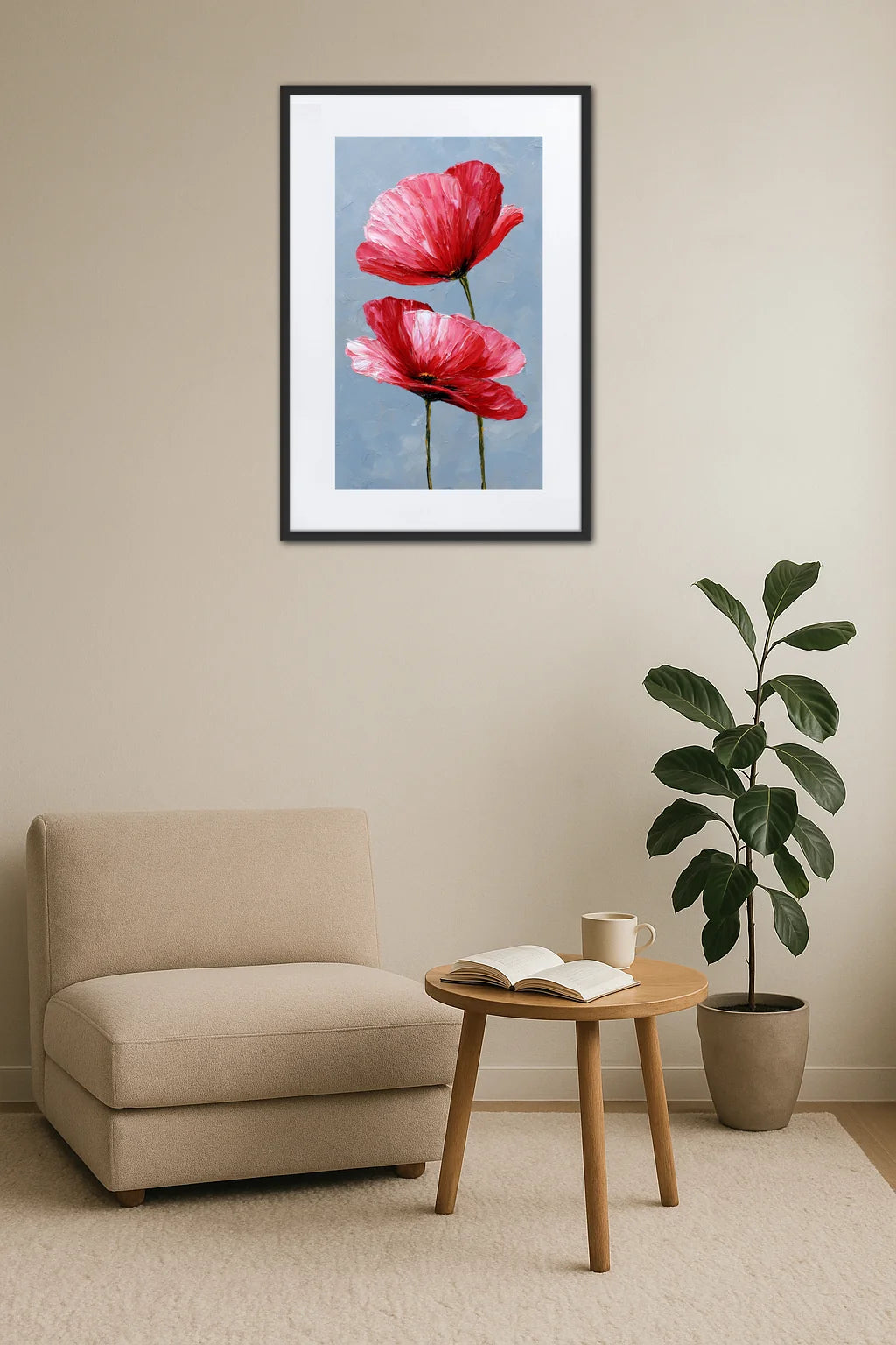 - Un contraste harmonieux : Le fond bleu clair apaise l’intensité des rouges éclatants, créant un équilibre visuel qui invite à la méditation. Cette harmonie des tons favorise un sentiment de sérénité intérieure, propice à la rêverie.