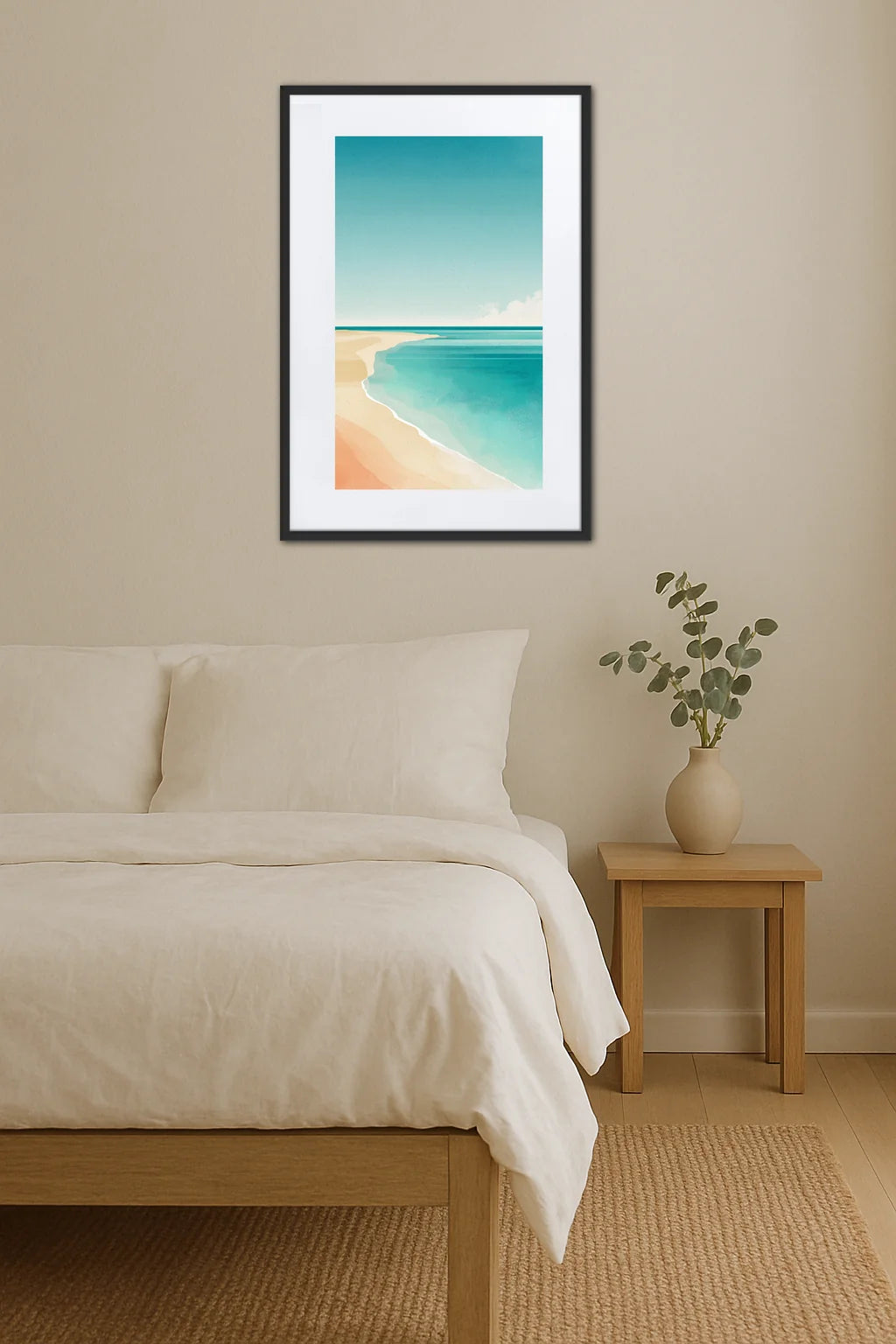 - Sensations d’espace : Le jeu délicat entre la plage et l’eau crée une profondeur qui donne la sensation d’un horizon infini. Cette perspective élargit la pièce, évoquant un sentiment d’évasion et de liberté qui nourrit l’imaginaire.
