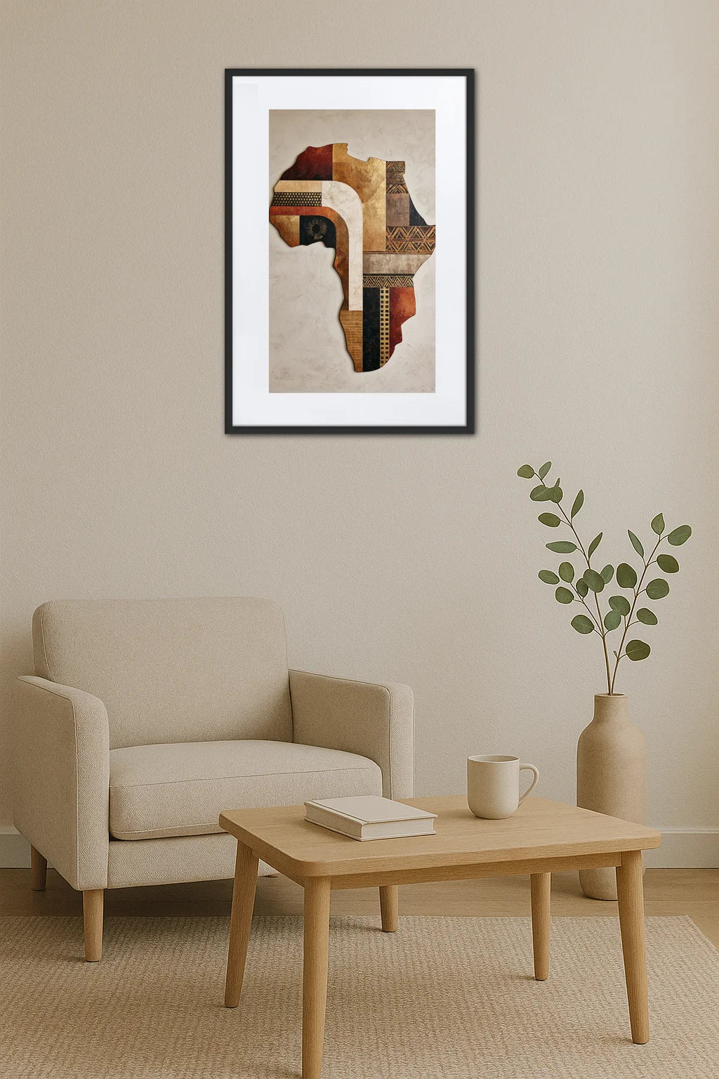 Cette œuvre est bien plus qu'une représentation visuelle, elle est une ode à l'âme africaine, un hommage aux racines profondément ancrées dans des terres riches et mystérieuses. La silhouette de l'Afrique se déploie comme un patchwork vivant, mêlant motifs traditionnels à une interprétation contemporaine qui résonne avec l'énergie d'hier et d'aujourd'hui. Le choix des matières et des formes évoque les récits ancestraux, le tissage des histoires transmises de génération en génération. La matière semble palpiter, entre craquelures et reliefs, traduisant à la fois la force et la fragilité d’un continent en perpétuel mouvement. Chaque segment géométrique invite à une lecture multiple, entre authenticité et modernité, comme une danse entre passé et avenir. Ce tableau offre ainsi une passerelle sensible, un dialogue silencieux entre la culture africaine et le regard du spectateur, qui se perd dans la richesse des détails et la profondeur des symboles, éveillant un sentiment d’appartenance et de découverte.