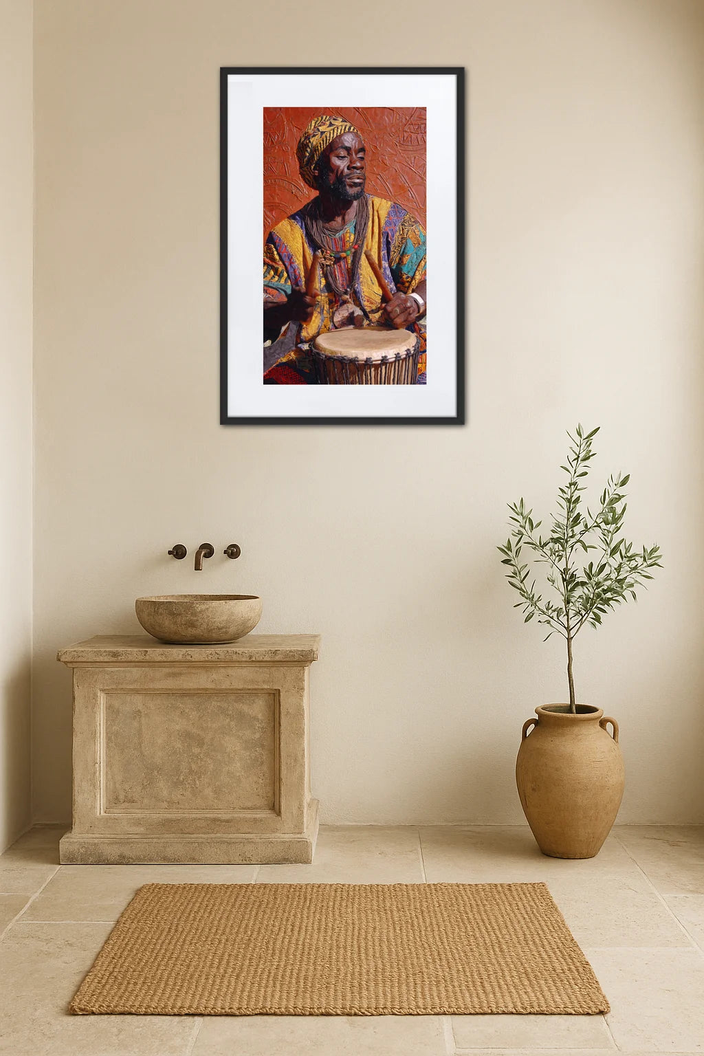 Ce tableau africain toile révèle plus qu’un simple portrait : il incarne l’âme d’une tradition vivante, où la musique et la couleur se mêlent pour créer un hommage vibrant à la vie. Le personnage représenté, un tambourinaire en pleine concentration, est le gardien des rythmes qui unissent les communautés, porteur d’une mémoire collective et d’une énergie qui transcende le temps. Son vêtement éclatant, riche en motifs et en nuances, raconte les histoires de tribus et de légendes, tandis que le fond terreux, empreint de textures délicates, évoque la terre nourricière et les racines profondes. Cette œuvre capte l’essence même d’un continent où chaque geste est une danse, chaque regard une invitation au partage. C’est une célébration de la culture africaine dans son expression la plus pure, un témoignage de la force des traditions qui perdurent malgré les époques. Le tableau fait vibrer l’espace qui l’accueille, insufflant une présence forte et chaleureuse, à la fois intime et universelle. Il invite le spectateur à ressentir cette fusion unique entre passé et présent, à écouter le silence vibrant du tambour, et à s’immerger dans cette atmosphère où l’art devient un pont entre les âmes.