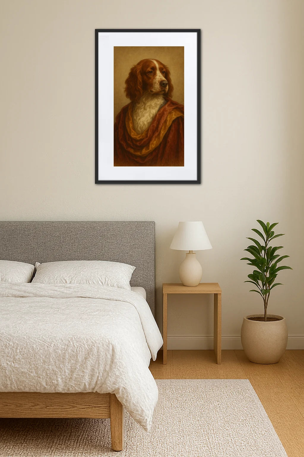 Dans cet hommage à l'art baroque, l'animal devient symbole d'une élégance et d'une dignité retrouvées, transcendées par le jeu subtil des matières et des plis majestueux qui l'enveloppent. Le portrait ne se limite pas à une simple représentation mais s'inscrit dans un dialogue entre humanité et nature, où chaque détail évoque une histoire, une émotion profonde. La lumière douce caresse la fourrure et les étoffes, révélant une palette chaleureuse qui invite à la contemplation. Ce tableau est une invitation à redécouvrir l'animal sous un angle inattendu, presque royal, où la puissance et la fragilité s'entrelacent avec grâce. On ressent l'aura d'un temps révolu, celui des grandes compositions où chaque élément est chargé de sens et d'héritage culturel. Ici, l'animal, paré de ses atours baroques, devient le miroir d'une âme, un porteur d'histoires silencieuses qui traversent les siècles. Cette œuvre capte ainsi la poésie d'une époque où l'art faisait vibrer les émotions les plus subtiles, offrant au spectateur un moment suspendu entre rêve et réalité.