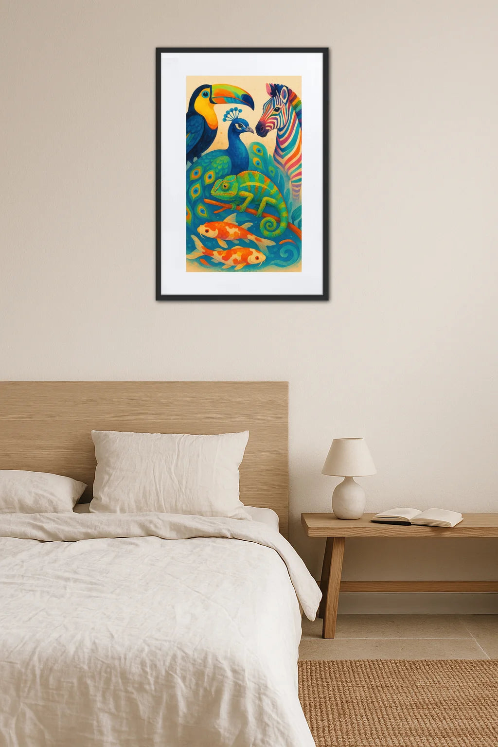 Ce tableau, véritable ode à la diversité animale, se déploie comme un hymne à la richesse des formes et des présences dans le règne vivant. Chaque créature y est magnifiée par des traits audacieux et des couleurs qui transcendent leur simple représentation. Le toucan, avec son bec majestueux, semble veiller sur le paon et ses plumes ornées d’yeux mystérieux, tandis que le caméléon, maître du changement, se fond dans un tourbillon de verts et d’orangés. La zèbre, quant à elle, se pare d’une palette inattendue, fusionnant rayures traditionnelles et éclats multicolores, comme un pont entre réalisme et imagination. Les poissons, flottant en contrebas, apportent une douceur flottante à cette composition, rappelant la fluidité de la vie. Cette scène n’est pas seulement un rassemblement d’animaux, mais une invitation à percevoir la beauté de la nature sous un prisme nouveau, où chaque détail devient une célébration de l’originalité et de la coexistence. Le tableau porte en lui une énergie vive et une poésie visuelle qui évoquent à la fois la joie de l’exploration artistique et le respect profond pour le monde animal, réinterprété par le prisme d’une créativité débordante.