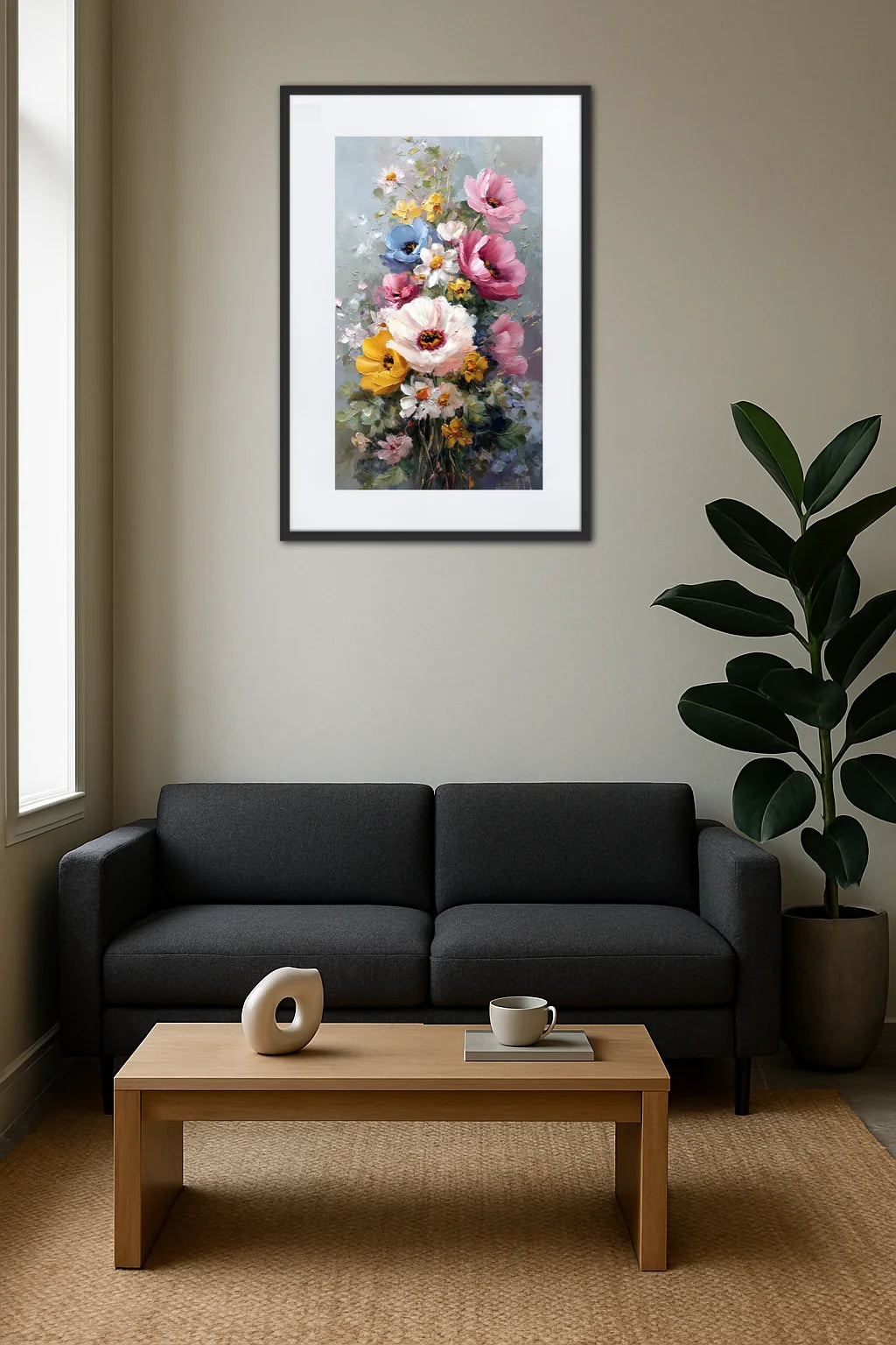 Dans cet assemblage où la nature se fait muse, le tableau s'élève au-delà d'une simple représentation. La palette choisie, tendre et chaleureuse, est une ode à la diversité des émotions humaines, capturant l'intensité d'un instant suspendu. Les fleurs, tour à tour fragiles et audacieuses, évoquent la dualité du vivant, ce fragile équilibre entre éclat et vulnérabilité. C'est une invitation à redécouvrir la beauté cachée dans la spontanéité, à travers le mouvement fluide des pétales qui semblent s'étirer vers la lumière. L'artiste joue avec les contrastes, mêlant douceur et vigueur, pour créer un langage visuel qui parle directement au cœur. Cette œuvre puise aussi dans une mémoire collective, où les fleurs symbolisent l'espoir, la renaissance et le mystère. Le fond, subtilement nuancé, offre un écrin qui met en valeur chaque floraison, comme un hommage silencieux à la nature en perpétuelle métamorphose. Plus qu'un simple décor, ce tableau est une expérience contemplative, un dialogue intime entre l'œil et l'âme, un écho de la beauté éphémère qui habite chaque jour.