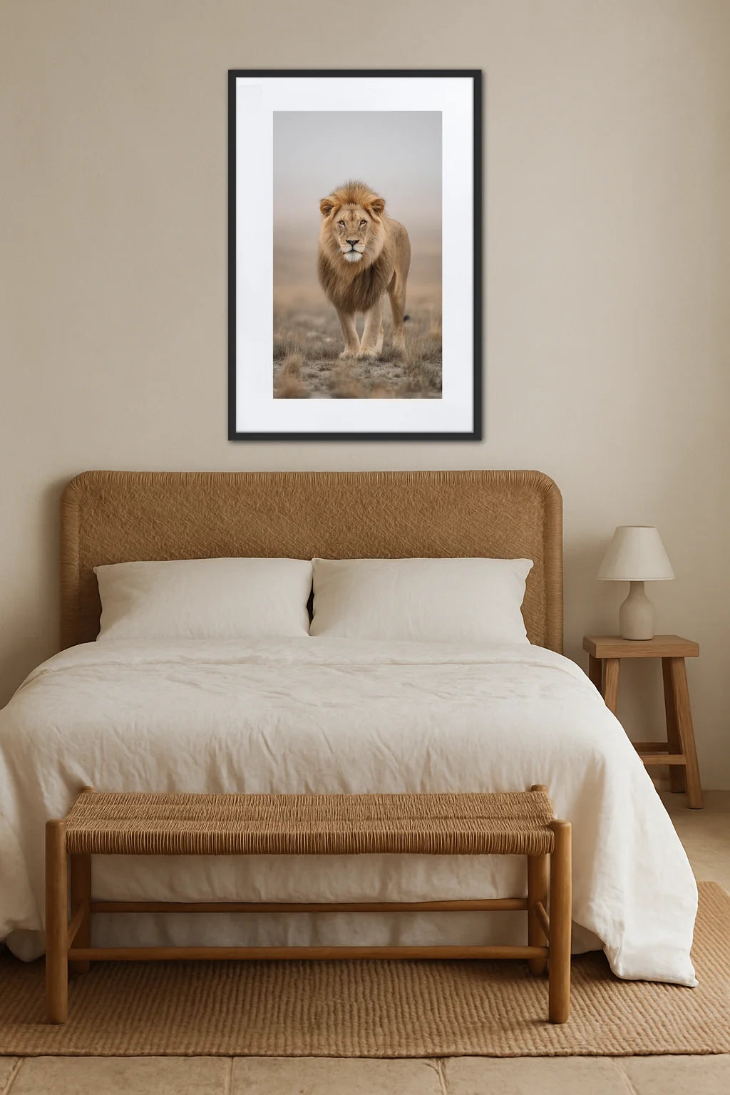 - Un contraste délicat : Le lion émerge doucement d’un arrière-plan flouté, soulignant la beauté de ses détails sans agressivité. Ce jeu de lumière et de profondeur invite à une immersion contemplative, éveillant une émotion douce et mystérieuse à la fois.