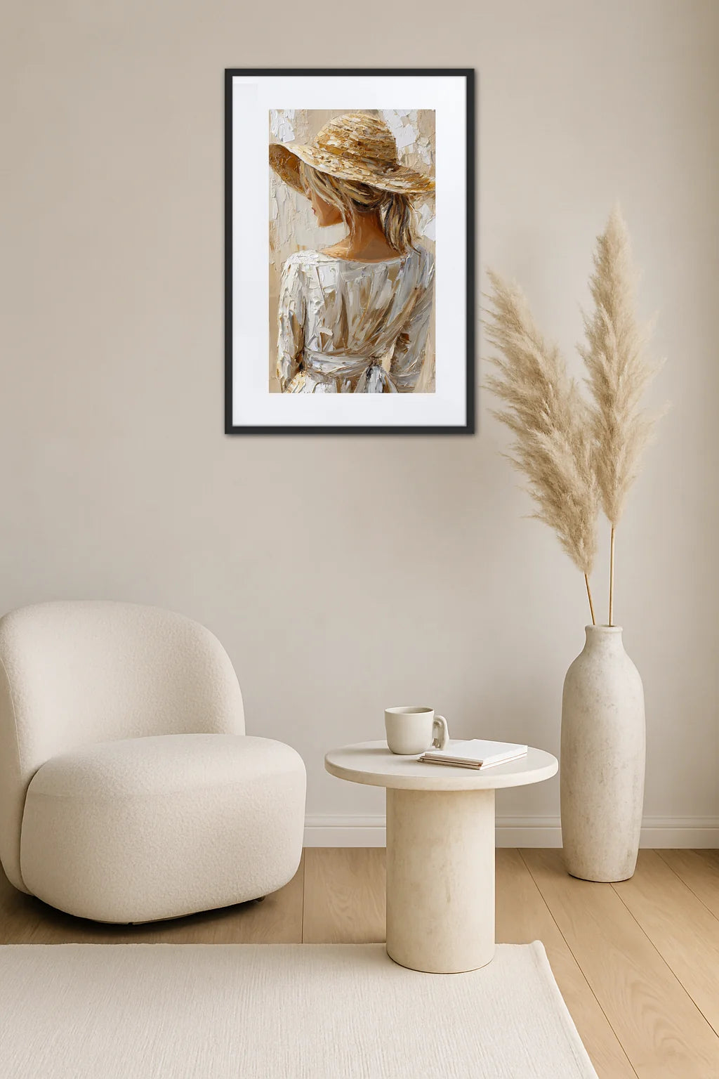 Ce Tableau Beige Femme incarne une poésie visuelle où la finesse des traits se mêle à une palette délicate, presque tactile. La femme, tournée vers l’inconnu, semble capturer l’essence même de la contemplation silencieuse, comme une confidence suspendue entre lumière et ombre. L’artiste joue sur les contrastes subtils entre la texture généreuse et la douceur des formes, créant un équilibre harmonieux qui invite à s’évader. Cette œuvre évoque aussi une certaine nostalgie, celle des après-midis d’été baignés de soleil, où chaque rayon raconte une histoire de sérénité et de liberté. L’allure élégante du chapeau de paille, symbole d’un style naturel et intemporel, ancre la scène dans un cadre à la fois universel et singulier. Le choix des teintes naturelles, proches des tons sable et ivoire, enveloppe la figure d’une aura chaleureuse et apaisante, rendant hommage à une féminité subtile et puissante. Au-delà de sa beauté plastique, ce tableau invite à un dialogue intime avec l’observateur, un échange où chacun peut projeter ses propres rêves et émotions, capturant l’instant précieux d’une présence à soi-même.