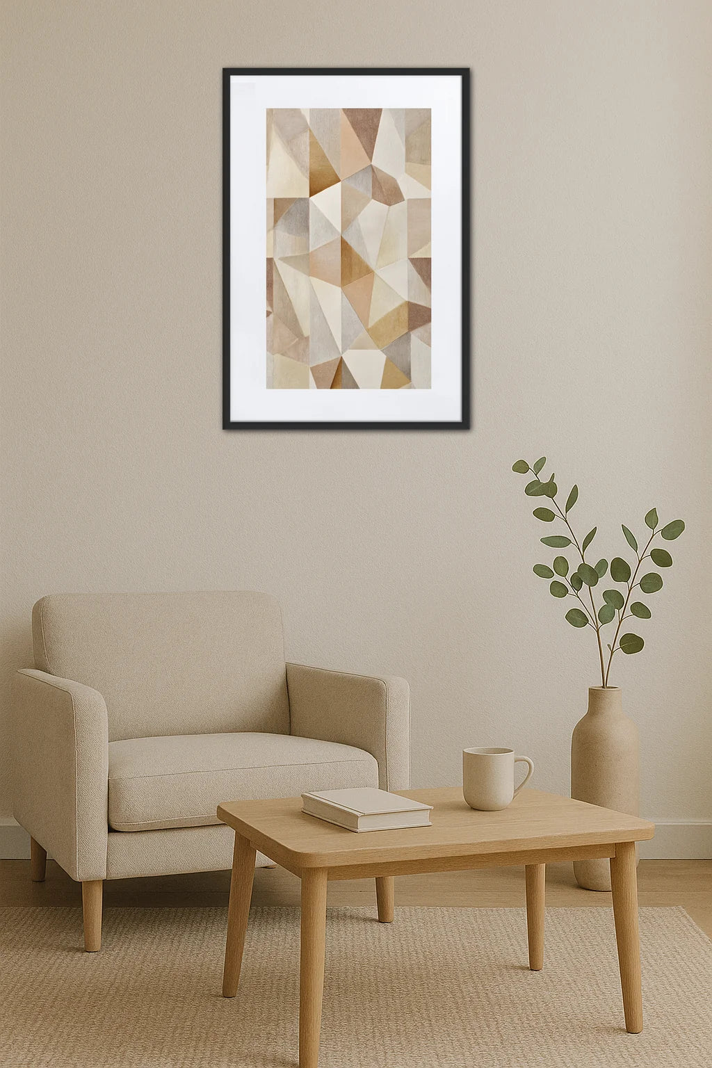 Ce tableau incarne une danse délicate entre les volumes et la lumière, où chaque forme triangulaire semble en équilibre fragile tout en racontant une histoire. L’artiste joue avec les nuances beiges, ocres et sable pour créer une profondeur qui invite à la rêverie, à la fois familière et mystérieuse. L’œuvre évoque un paysage abstrait, presque minéral, où la géométrie devient langage, une langue faite de contrastes nuancés et de rencontres inattendues. Il s’agit d’un hommage à la simplicité sophistiquée, à la beauté qui naît de la suggestion plutôt que de l’excès. Par sa composition rigoureuse mais fluide, ce tableau questionne la perception, offrant une expérience contemplative qui transcende les frontières de l’art décoratif. Cette pièce s’impose comme un pont entre tradition et modernité, mêlant culture visuelle et émotion avec une aisance rare. Elle invite à une immersion silencieuse, où chaque regard découvre un détail nouveau, un éclat subtil, une émotion retissée dans le temps. Plus qu’un simple élément décoratif, c’est un compagnon de réflexion et de calme, une présence artistique qui enrichit l’atmosphère intérieure par sa présence discrète mais forte.