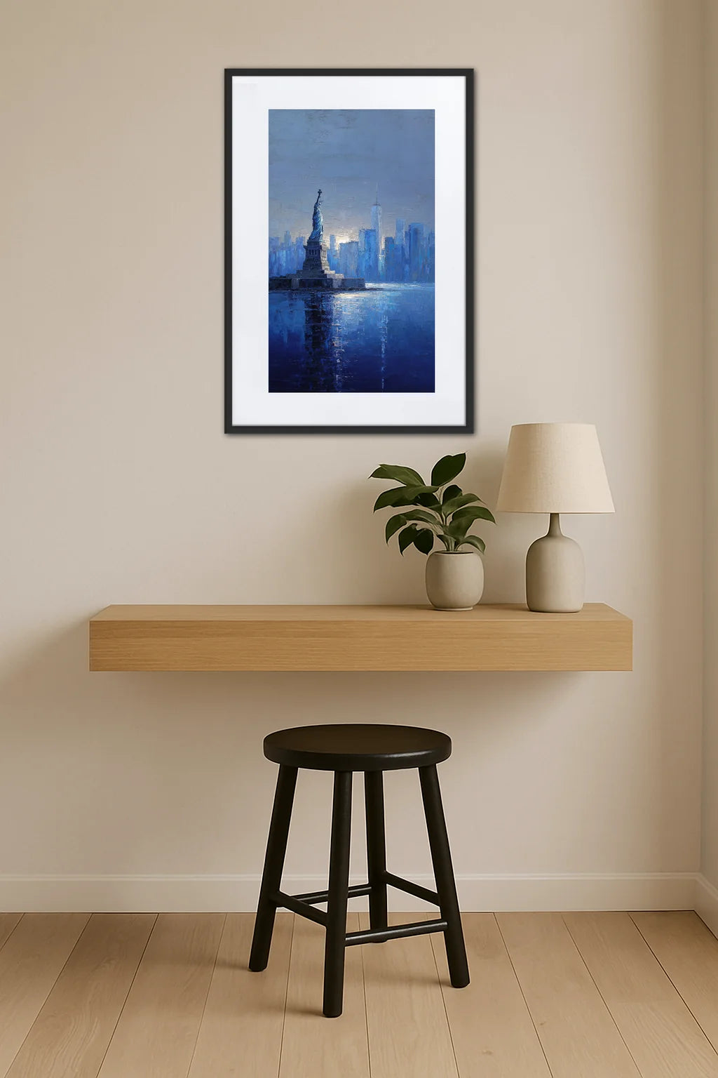 Ce tableau plonge le spectateur dans une vision poétique de New York, où la célèbre Statue de la Liberté se dresse fièrement au premier plan, éclairée par une lumière qui semble naître de l'horizon. La ville, à la fois proche et lointaine, se dessine dans des nuances profondes de bleu, évoquant la fraîcheur du matin et la promesse d’un jour nouveau. L’œuvre joue avec les contrastes entre la solidité des bâtisses et la fluidité de l’eau, reflet parfait de la métropole qui ne dort jamais. Chaque coup de pinceau semble capturer le souffle même de la ville, cet esprit indomptable fait de rêves et d’ambitions. Le choix de cette teinte enveloppante confère à l’ensemble une atmosphère à la fois élégante et mystérieuse, suggérant que derrière chaque lumière, chaque ombre, se cache une histoire à découvrir. Plus qu’un simple décor, ce tableau est une invitation à la contemplation, à l’émerveillement devant la beauté brute et sophistiquée d’un lieu qui inspire depuis toujours artistes et voyageurs.