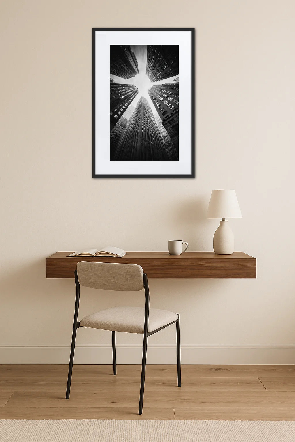 Le Tableau Building New York explore avec intensité la puissance architecturale de la ville qui ne dort jamais. En s’immergeant dans cette perspective unique, le spectateur est invité à lever les yeux vers ces silhouettes monumentales qui semblent défier le ciel, symboles d’une modernité bâtie sur la détermination et le rêve. Le noir et blanc détourne l’image de la réalité, pour révéler toute la rigueur et la poésie qui s’entrelacent dans les façades, les fenêtres et les ombres qui se dessinent. Cette œuvre raconte aussi une histoire humaine, celle des milliers d’âmes qui vivent et façonnent cette métropole, entre espoir et défi. Elle fait écho à l’énergie constante qui pulse dans chaque rue, où chaque bâtiment devient une cathédrale urbaine, reflet d’une époque et d’un mode de vie. Ce tableau invite à la méditation sur le contraste entre la masse imposante de la pierre et la fragilité du ciel, entre l’ambition sans fin et le calme suspendu d’un instant capturé. C’est un hommage à New York, à sa capacité à inspirer, transcender et surprendre à chaque regard porté vers le haut.