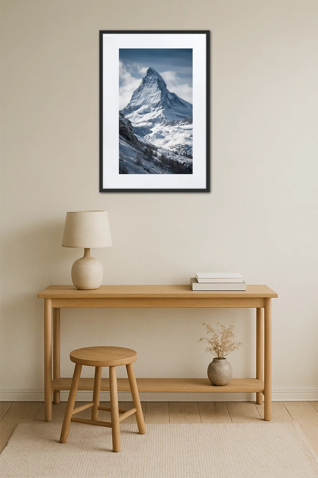 - Une profondeur visuelle fascinante : La verticalité du Cervin attire le regard vers le haut, créant une sensation d’élévation et d’émerveillement. Ce jeu de perspective invite à ressentir la grandeur et l’infini, éveillant un souffle d’inspiration et de liberté intérieure.