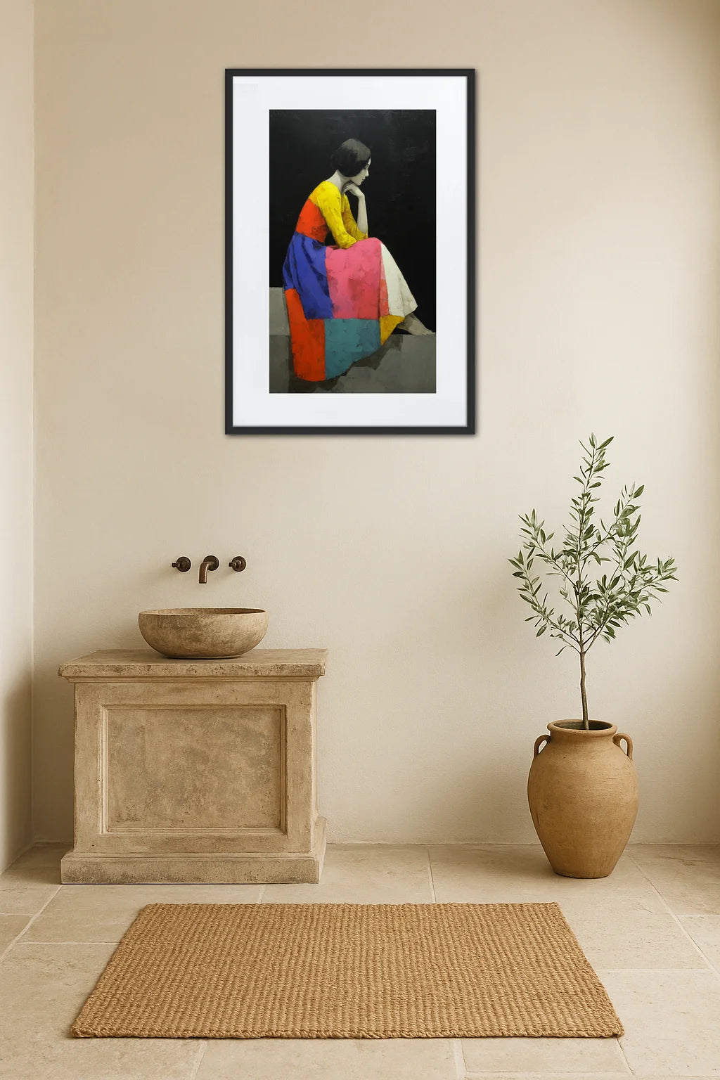 - Une posture pleine de grâce et de silence intérieur : La femme assise, pensive, dégage une élégance naturelle qui parle d’équilibre et de sagesse. Ce contraste avec les couleurs vives de sa tenue révèle une dualité touchante, celle de l’expression extérieure et des émotions intérieures, suscitant une connexion intime avec le spectateur.