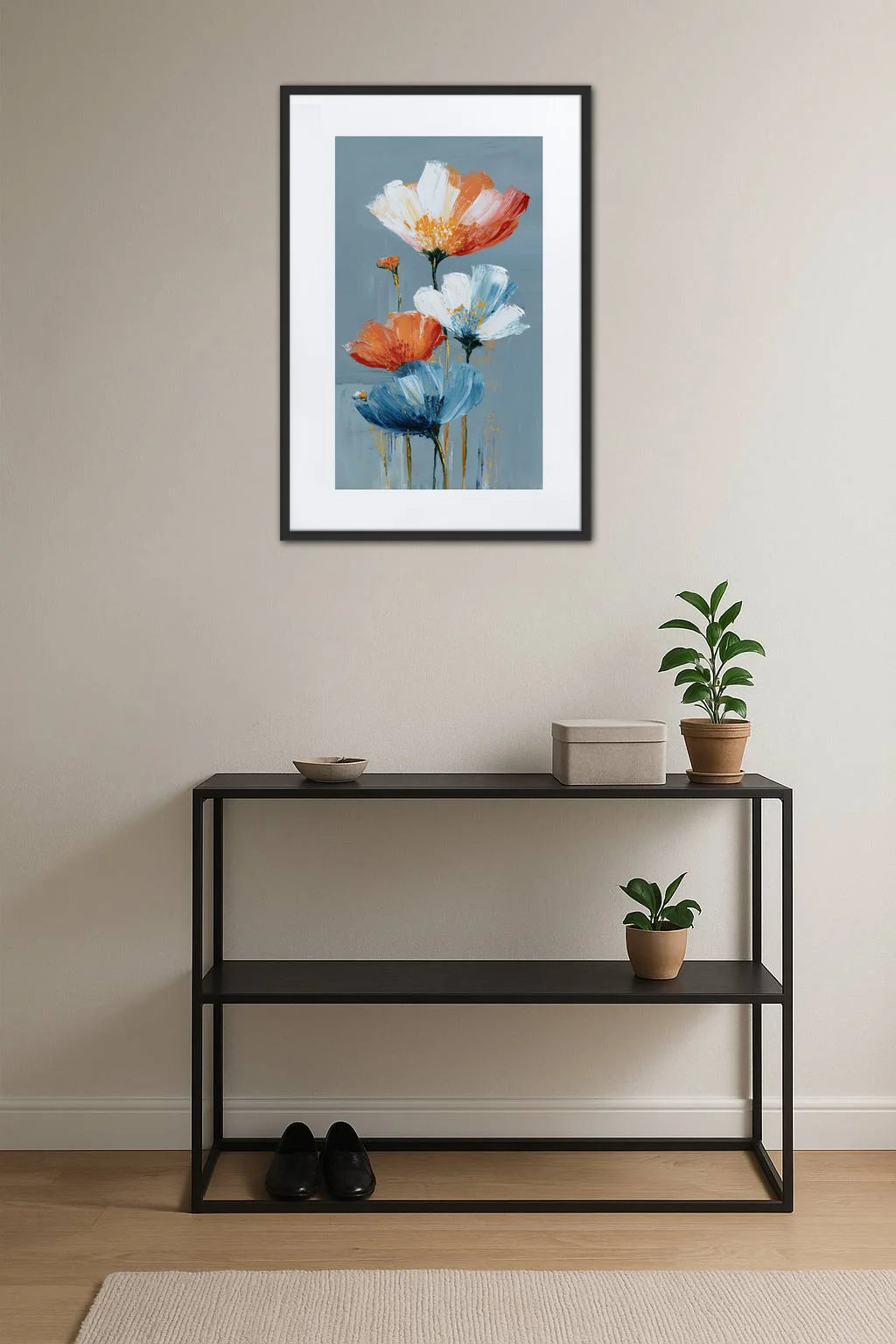 Cette œuvre, empreinte d'une modernité subtile, explore la rencontre entre la nature et l'interprétation artistique. Les fleurs, peintes avec des gestes à la fois précis et libres, offrent un dialogue entre formes et textures où le vif dialogue avec le posé. Le choix de nuances chaleureuses mêlées à des touches plus froides crée un contraste qui évoque les cycles de la vie et les émotions changeantes qui les accompagnent. On y perçoit une célébration du vivant, une invitation à s'attarder sur la beauté éphémère qui nous entoure, tout en redéfinissant le langage floral par une approche contemporaine qui transcende le simple motif décoratif. La composition, à la fois aérienne et structurée, capte l'attention par son équilibre singulier, guidant le regard au fil des pétales ouverts vers une contemplation inspirée. En s'immergeant dans cette création, on ressent la force tranquille d'une nature réinventée, où chaque détail devient un instant suspendu, une émotion rendue visible dans un souffle coloré.