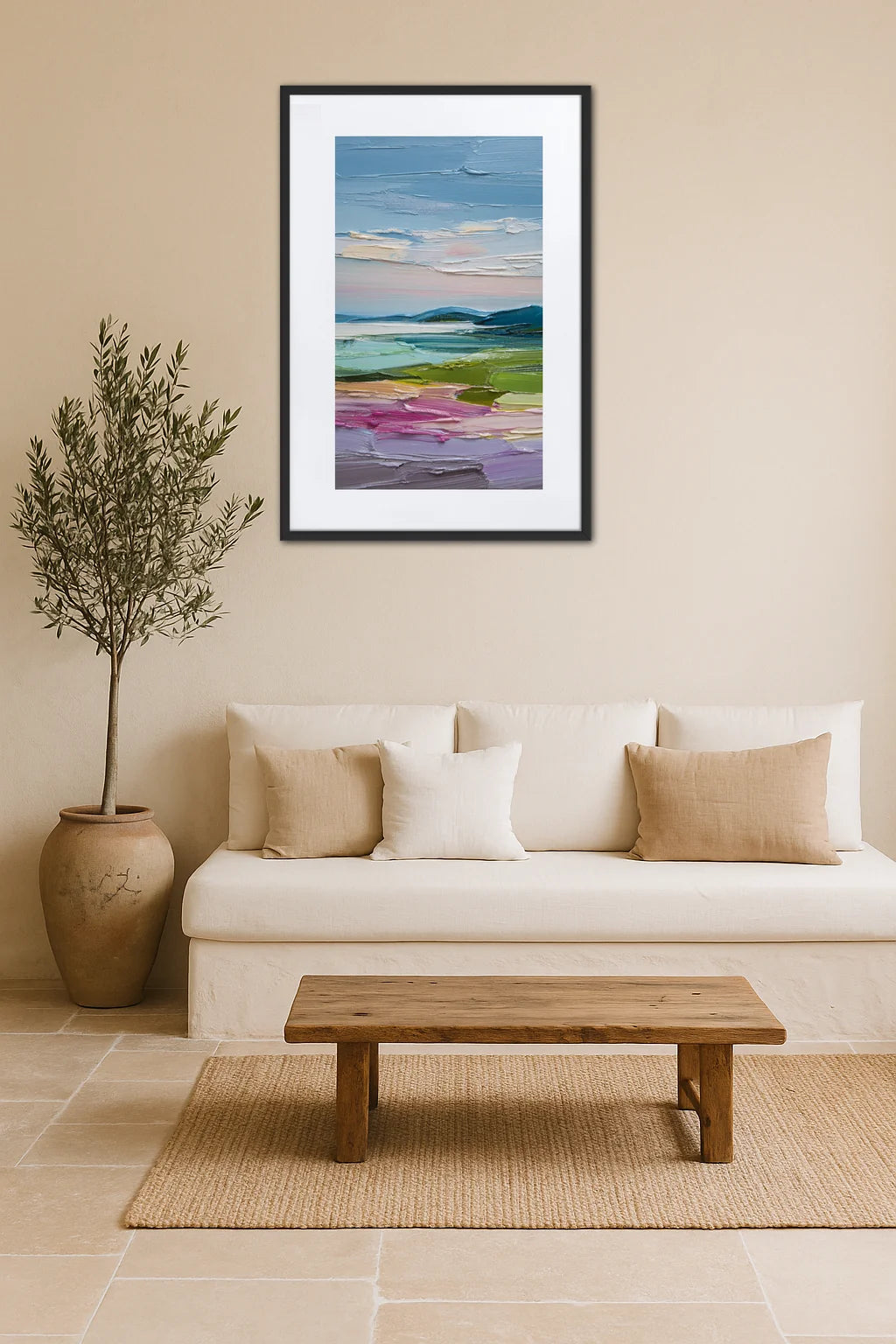 Ce tableau contemporain grand format est une ode à l’horizon infini, un dialogue entre la terre et le ciel où les couleurs se superposent en couches épaisses, presque palpables, qui traduisent la matière brute du monde. L’artiste s’est inspiré des paysages traversés au fil du temps, mêlant souvenirs et impressions fugitives, pour créer un univers où la nature se fait à la fois familière et mystérieuse. Les nuances de bleu profond rencontrent des touches de vert tendre, tandis que des éclats de rose et de mauve apportent une douceur inattendue, comme un murmure au cœur du silence. Cette composition évoque une promenade au crépuscule, lorsque la lumière décline et que les formes se fondent dans une harmonie délicate. Le tableau invite à une contemplation où le regard se perd dans l’espace infini, éveillant des sensations de calme et de liberté. Plus qu’une simple représentation, il incarne une expérience sensorielle, une invitation au rêve éveillé qui nourrit l’âme et stimule l’imaginaire. Chaque regard porté sur cette œuvre révèle une nouvelle facette, un détail caché, une émotion renouvelée, faisant de ce tableau une pièce intemporelle et profondément vivante.