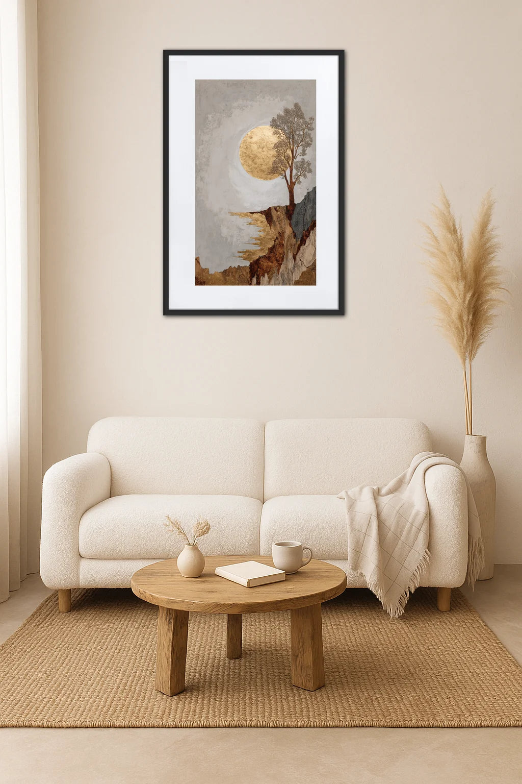Cette œuvre contemporaine puise son essence dans le dialogue entre l’élément naturel et une abstraction délicate. La silhouette d’un arbre solitaire, dressée au bord d’un précipice, semble à la fois fragile et majestueuse. La lumière dorée qui l’accompagne, évoquant un astre mystérieux, transcende la scène en une métaphore de l’espoir et de la persévérance. Le choix des textures évoque la matière brute de la terre et du temps qui passe, tandis que les teintes neutres laissent place à une émotion sereine, presque méditative. Cette composition invite à un retour à l’essentiel, à la contemplation d’un monde où la nature et l’art se fondent en une même respiration. Plus qu’une simple représentation, ce tableau devient une invitation à s’arrêter, à ressentir la beauté fragile de l’instant suspendu, où l’œil se perd dans la profondeur des contrastes et des formes. Il parle à la fois à l’âme et à l’esprit, à travers cette iconographie détournée qui mêle la douceur de l’arbre et la puissance du soleil, dans un équilibre subtil et poétique.
