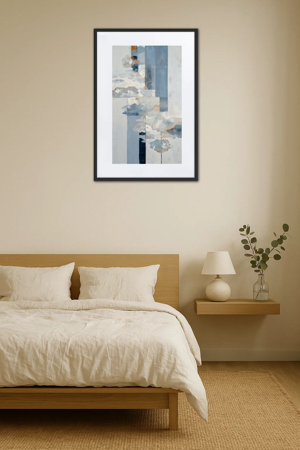 Cette œuvre s’inscrit dans une quête d’équilibre entre abstraction et figuration, où les formes géométriques croisent des nuages évanescents. Chaque élément semble flotter dans un espace suspendu, où le temps s’efface pour laisser place à une immersion sensorielle. La palette choisie, dominée par des nuances de bleu et de gris agrémentées de touches chaudes, évoque la douceur d’un ciel d’aube ou d’un paysage urbain baigné de lumière douce. Le tableau dialogue avec l’âme, offrant une pause dans le tumulte quotidien. Il raconte l’histoire d’un monde en mutation, où la rigueur des lignes rencontre la poésie des formes libres. Cette création invite à un voyage intérieur, à la découverte d’une atmosphère où l’émotion se mêle à la réflexion, unissant les sens et la pensée dans une harmonie singulière.