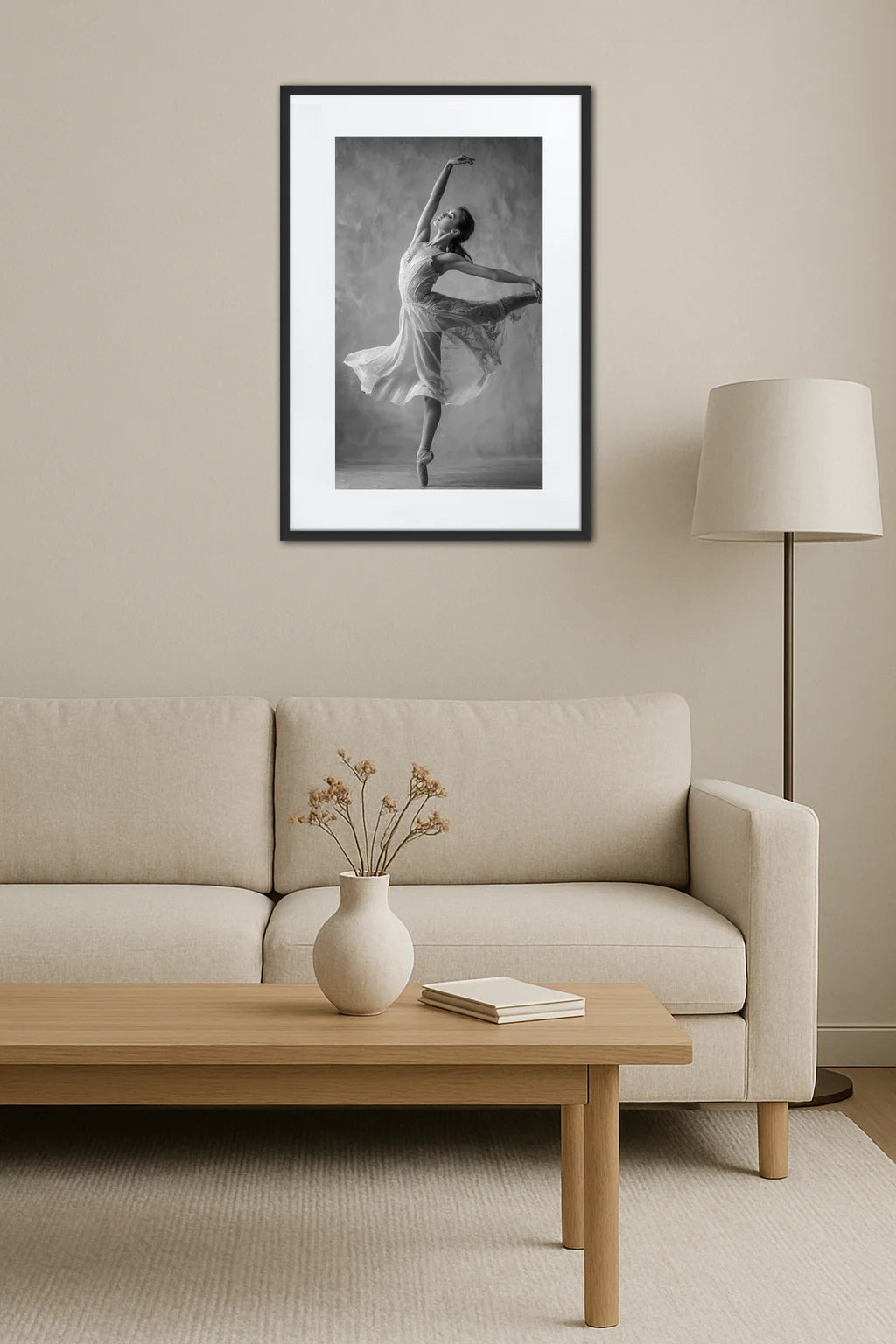 Cette œuvre incarne le dialogue intime entre la forme et le vide, où la danseuse semble à la fois figée et en pleine élévation. Dans ce jeu subtil entre ombre et clarté, le corps dessine une poésie silencieuse, évoquant la fragilité et la puissance d’un instant suspendu. Le choix du noir et blanc confère à la scène une intemporalité, faisant résonner une émotion pure, débarrassée de tout superflu. Cette composition rappelle les photographies classiques du ballet, mêlant rigueur et fluidité, tradition et modernité. L’artiste capte ici la quintessence de la danse, ce mélange d’effort et de légèreté, d’équilibre et de mouvement perpétuel. Elle invite à une contemplation profonde, presque méditative, où chaque regard découvre une nouvelle nuance, un nouveau détail, une sensation insoupçonnée. Au-delà du simple portrait, ce tableau devient un hommage vibrant à l’art sous toutes ses formes, à cette capacité qu’a la beauté de transcender le quotidien pour atteindre l’âme. C’est une invitation à se laisser porter par l’élan de la vie, à ressentir dans la matière même l’énergie d’un rêve qui s’incarne et s’élève.