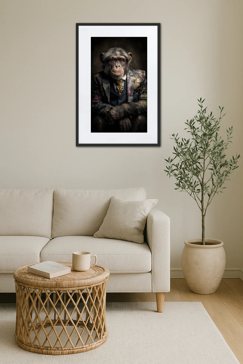 - Un contraste saisissant : Le costume riche en nuances crée un dialogue visuel vibrant avec la peau sombre du singe, éveillant une sensation de profondeur et de mystère. Cette rencontre des textures stimule une émotion profonde, comme une invitation à découvrir ce qui se cache derrière le regard.