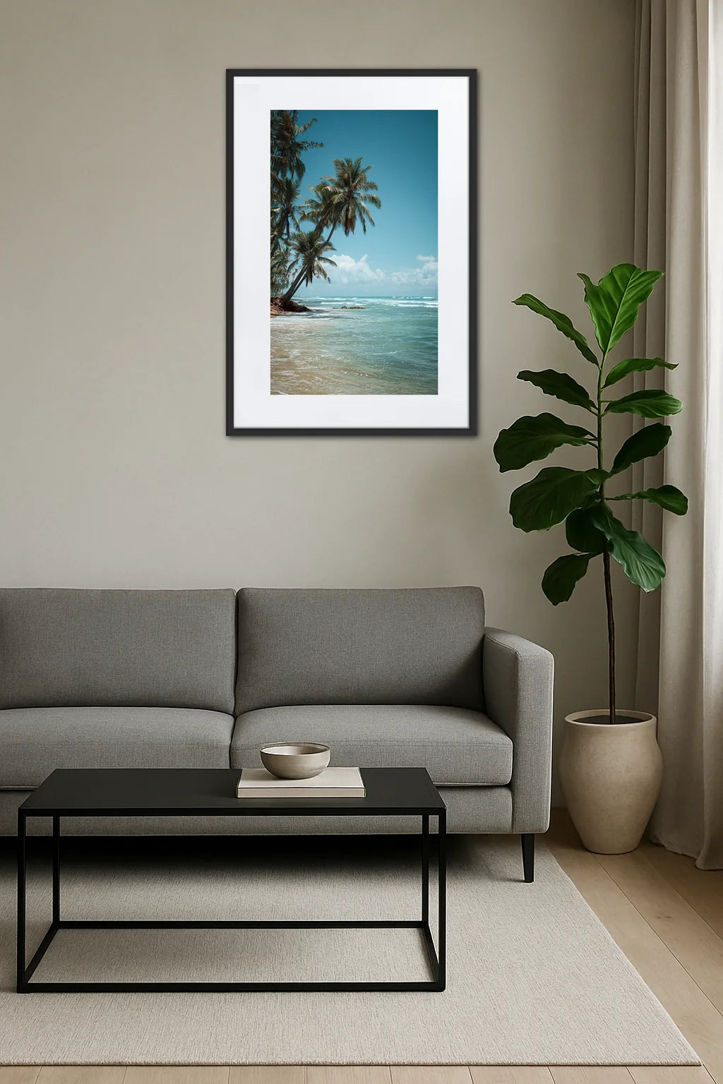 - Un contraste subtil et élégant : Le vert profond des palmiers contre le bleu vibrant de l’océan crée une dynamique visuelle qui capte le regard. Cette alliance de teintes invite à la sérénité tout en évoquant la richesse et la diversité de la nature, offrant une expérience esthétique pleine de douceur et de profondeur.