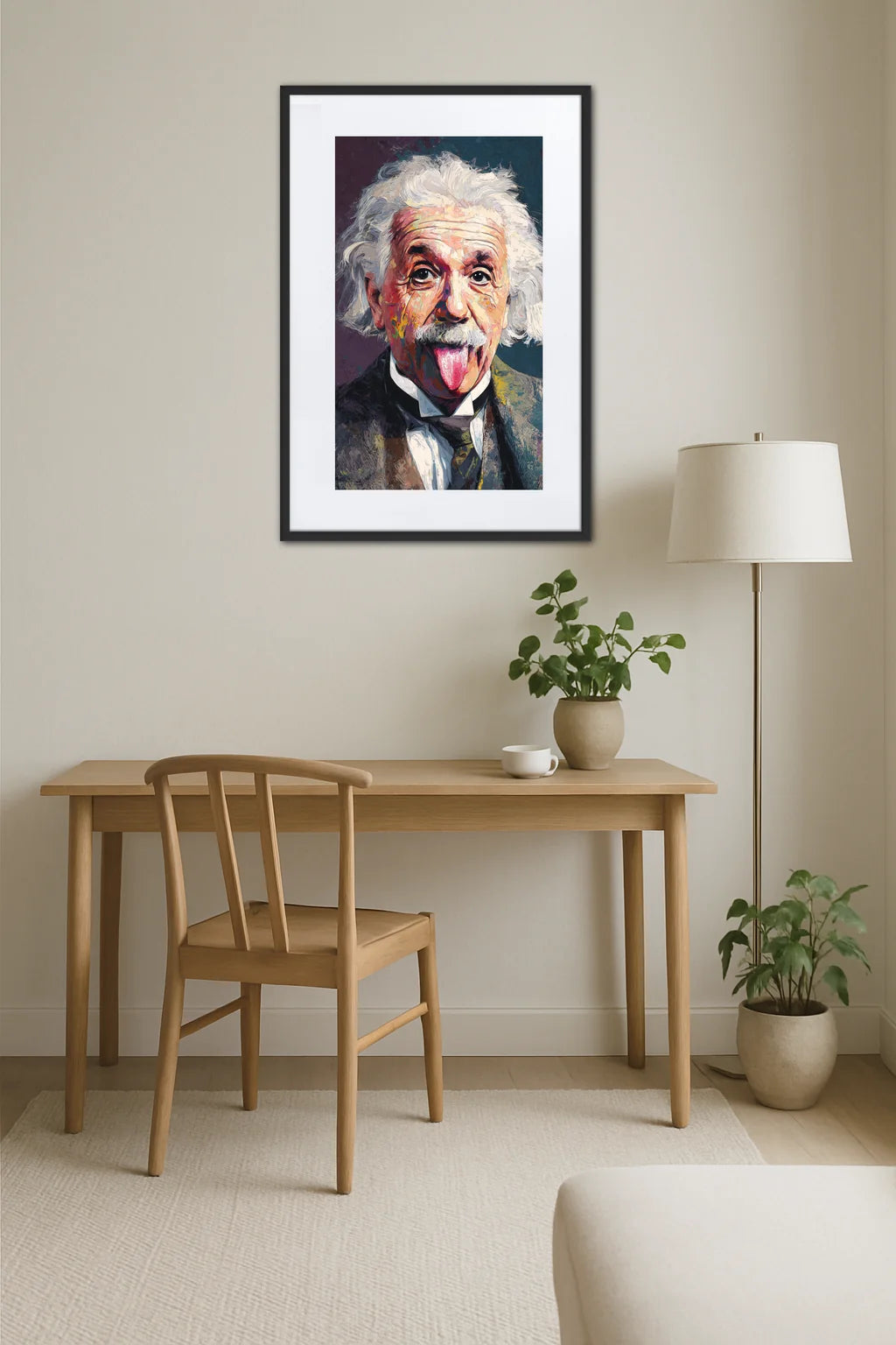 - Une expression pleine de vie : Le sourire espiègle et la langue tirée d’Einstein insufflent une dose de malice et de liberté. Ce geste léger transforme l’ambiance, apportant une joie discrète qui invite à l’émerveillement et au sourire intérieur.