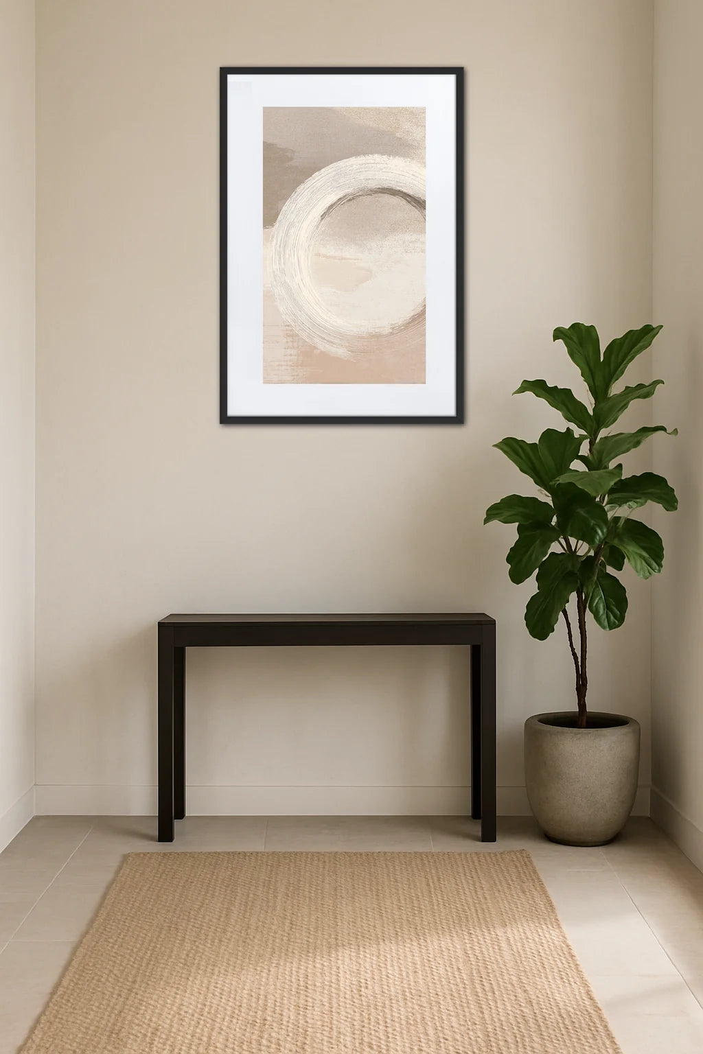 Cette œuvre puise son essence dans les traditions contemplatives, où chaque geste peint devient un acte de présence et d’expression de soi. Le cercle tracé avec assurance et légèreté symbolise le cycle infini de la vie, la perfection imparfaite qui invite à l’acceptation et à la sérénité. Les nuances délicates de beige, de sable et de blanc se fondent les unes dans les autres comme les brumes matinales d’un jardin japonais, évoquant un paysage intérieur où le calme règne. L’absence de détails superflus laisse place à l’essentiel, à cette invitation à ralentir, à observer avec attention et à se reconnecter à l’instant présent. Ce tableau dialogue avec l’âme, il murmure la sagesse ancienne des cercles Zen, où la forme devient un pont entre le visible et l’invisible. En le contemplant, on perçoit la beauté dans la simplicité, une élégance naturelle qui transcende le temps et les modes. Il rappelle que l’équilibre n’est pas une destination mais un chemin, un mouvement continu qui nourrit le corps et l’esprit. Cette œuvre est une ode à l’harmonie, une respiration visuelle qui apaise et inspire à la fois.