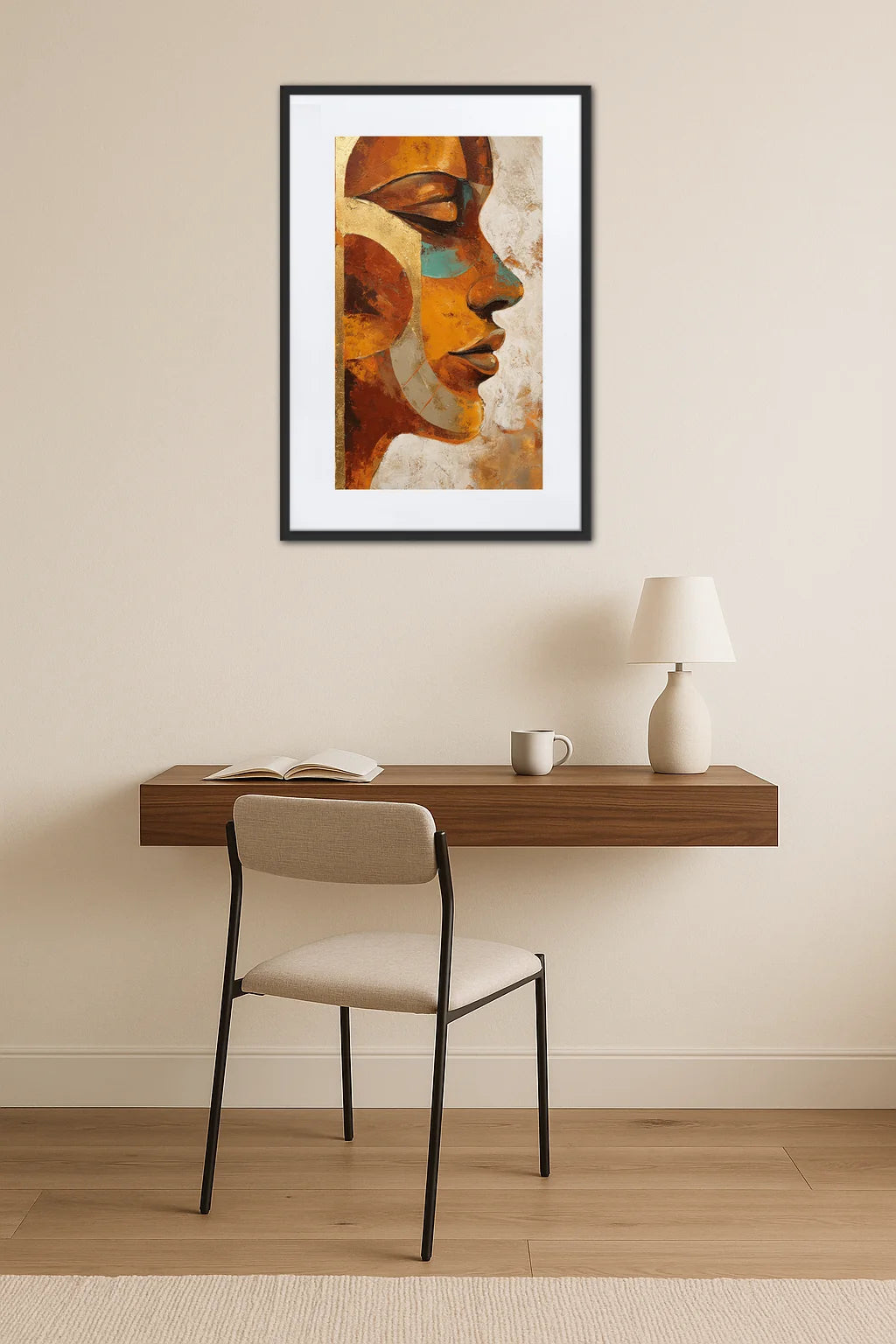 Cette œuvre est bien plus qu’une représentation. Elle capte l’essence d’une culture, un souffle ancestral nourri d’authenticité et de modernité. La silhouette féminine, à la fois douce et puissante, semble se détacher d’un passé riche tout en affirmant son ancrage dans le présent. Les formes organiques et les aplats généreux dessinent un visage où se mêlent silence intérieur et force extérieure. Chaque teinte chaude, chaque courbe, évoque la terre africaine, avec ses traditions, ses rites, et ses récits transmis de génération en génération. Ce tableau invite à un dialogue intime, une rencontre entre une histoire personnelle et une narration universelle. Il célèbre la femme africaine en toute complexité, entre mystère et lumière, sagesse et passion. Le choix de l’abstraction, loin de figer un simple visage, ouvre à une interprétation libre, où chacun peut ressentir les vibrations d’un patrimoine vivant, vibrant et en perpétuelle évolution. Plus qu’une image, c’est un hommage vibrant à l’identité, à la beauté et à la résilience. Une œuvre qui transforme chaque espace en une invitation à la réflexion et à l’émerveillement.