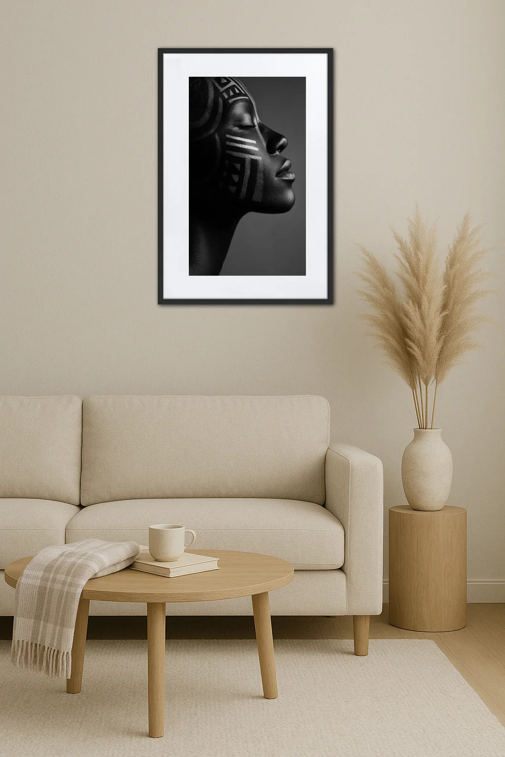 Ce tableau incarne la rencontre entre la modernité et la tradition, où la féminité africaine se dévoile dans toute sa profondeur. Le visage, capturé en profil, s'illumine d'une sérénité puissante, tandis que les motifs géométriques, hérités d'une symbolique ancestrale, racontent une histoire d'appartenance et de mémoire. Le contraste entre l'ombre et la lumière souligne la richesse des textures et la complexité des émotions, évoquant la dualité entre force et douceur, mystère et clarté. Cette œuvre ne se contente pas d'être un simple portrait ; elle est un hommage vibrant à la beauté et à la résilience des femmes africaines, à leur culture riche et à leur histoire millénaire. Elle invite à la contemplation, au respect et à la célébration de cette identité plurielle, tout en insufflant une énergie apaisante et inspirante dans l'espace qu'elle habite. Ainsi, elle devient un pont entre les époques, un dialogue silencieux entre passé et présent, une invitation à ressentir plus qu'à voir.