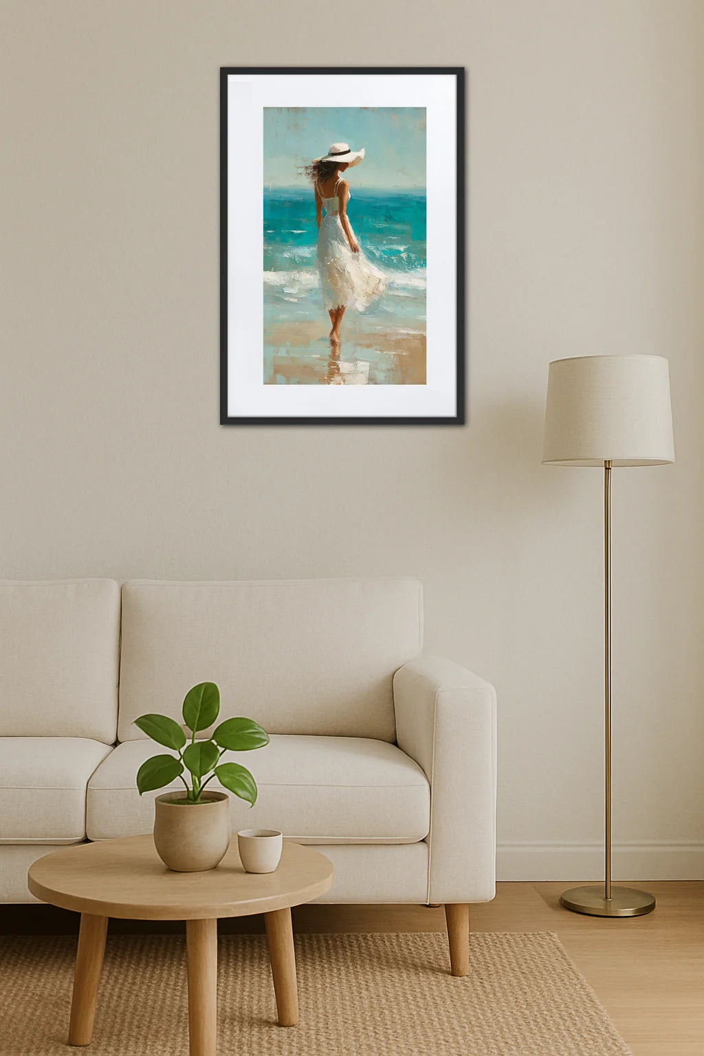 Cette œuvre, à la fois délicate et puissante, raconte le dialogue intime entre une femme et la mer. Elle incarne une pause suspendue dans le temps, où chaque geste semble empreint d’une douce mélancolie et d’une liberté retrouvée. Le blanc immaculé de sa robe flotte au vent, rappelant la pureté d’un rêve éveillé, tandis que le bleu profond de l’océan invite à la contemplation et à l’évasion. Plus qu’une simple représentation, le tableau évoque le lien ancestral que l’humanité entretient avec l’immensité marine, source d’inspiration et de mystère. Le chapeau qui voile partiellement son visage suggère une histoire à demi-ouverte, laissant place à l’imaginaire et à la poésie intérieure. On ressent l’énergie vibrante du large, le contraste entre la fragilité humaine et la majesté de la nature, comme un souffle vital qui traverse l’espace visuel. Ce tableau s’inscrit dans une tradition artistique où la lumière et la matière dialoguent avec élégance, offrant un voyage sensoriel au cœur d’une scène à la fois intemporelle et contemporaine. Il invite chacun à retrouver cette part d’émerveillement et de calme que seule la mer sait éveiller.