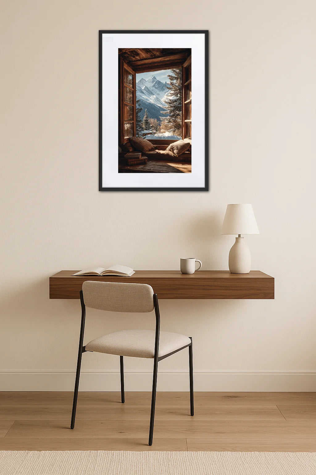 Cette œuvre saisit l’instant précieux où la nature se fait refuge et la montagne un souffle d’éternité. À travers les battants ouverts d’une fenêtre en bois patiné, le spectateur découvre un paysage majestueux, où les cimes enneigées s’élèvent comme des sentinelles silencieuses. L’intérieur, avec ses coussins moelleux et ses livres posés négligemment, évoque une atmosphère douce et intime, un cocon suspendu hors du temps. Cette vision évoque une pause dans le tumulte du monde, un retour à l’essentiel où les contrastes entre la chaleur du bois et la fraîcheur des sommets dialoguent avec délicatesse. Le tableau, au-delà de son aspect décoratif, résonne comme une méditation sur l’équilibre entre l’homme et la nature, sur la poésie d’un instant où tout semble possible. La lumière naturelle qui inonde la pièce suggère la promesse d’un jour nouveau, d’une énergie renouvelée, tandis que la majesté des montagnes rappelle la grandeur et la force tranquille du paysage alpin. C’est un hommage à la beauté brute et authentique, portée par une iconographie simple mais profondément évocatrice qui invite à la rêverie et à la contemplation.