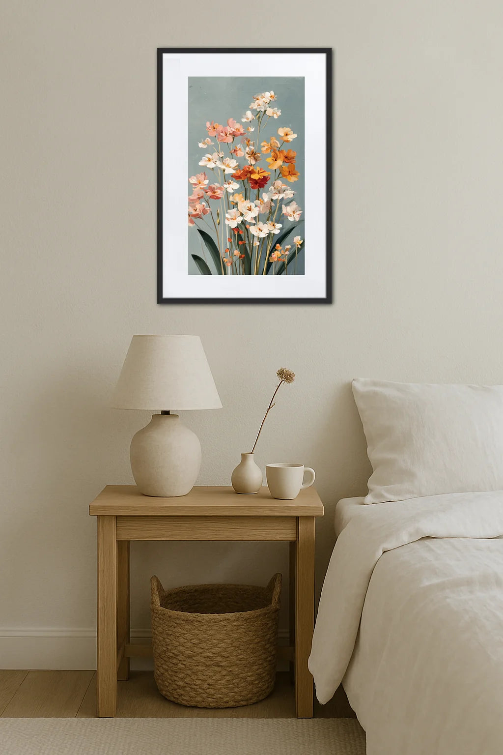 Ce tableau Fleur Botanique est une ode à la beauté fugace et pourtant éternelle des fleurs, un hymne à la nature réinterprétée avec une sensibilité contemporaine. Les fleurs, aux formes délicates et aux teintes chaleureuses, s’élèvent avec légèreté sur un fond apaisant qui laisse vibrer chaque nuance. L’œuvre évoque cette double nature du végétal : fragile et pourtant plein de vie, simple et complexe à la fois. Elle s’inspire des jardins secrets, ces havres de paix où l’on se perd pour mieux se retrouver, mêlant la douceur des pétales à la force tranquille des tiges. L’artiste joue avec le contraste entre lumière et ombre, donnant à l’ensemble une profondeur qui pousse à l’introspection. Culturellement, ce tableau dialogue avec les traditions picturales florales tout en les réinventant, mêlant classicisme et modernité. Il invite à une pause, à un moment suspendu où la nature devient langage et émotion. C’est une invitation à laisser son regard vagabonder, à ressentir la poésie qui s’échappe de ce bouquet, comme un murmure tendre au cœur de votre intérieur.