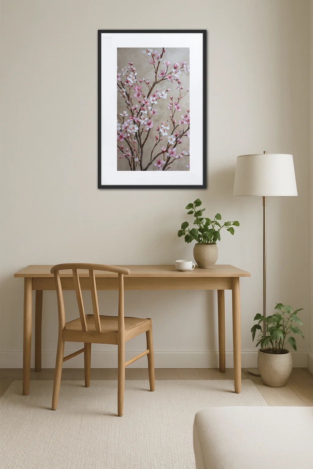 - Équilibre harmonieux : Les branches sinueuses contrastent avec la douceur des pétales, créant un jeu subtil d’ombres et de lumières. Ce contraste stimule une émotion profonde, celle d’une nature vivante et vibrante qui dialogue avec votre regard.