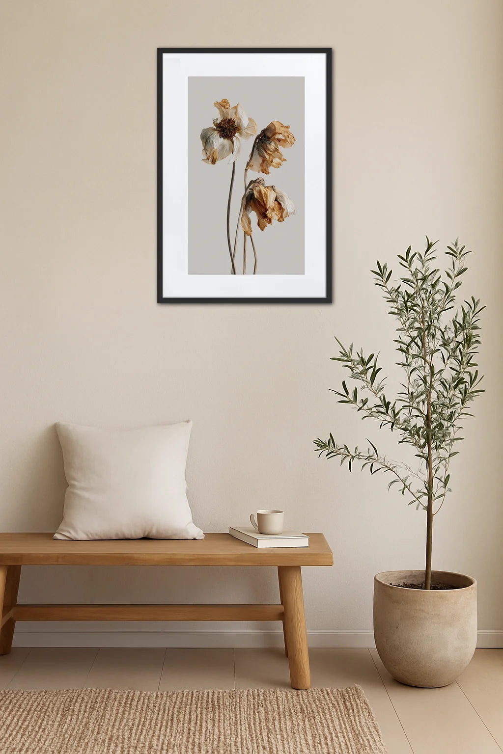 - Un charme visuel unique : La délicatesse des fleurs fanées crée un contraste saisissant avec le fond neutre, apportant une profondeur visuelle qui capte le regard. Cette harmonie subtile invite à une immersion apaisante, éveillant une sensation de calme et de sérénité intérieure.