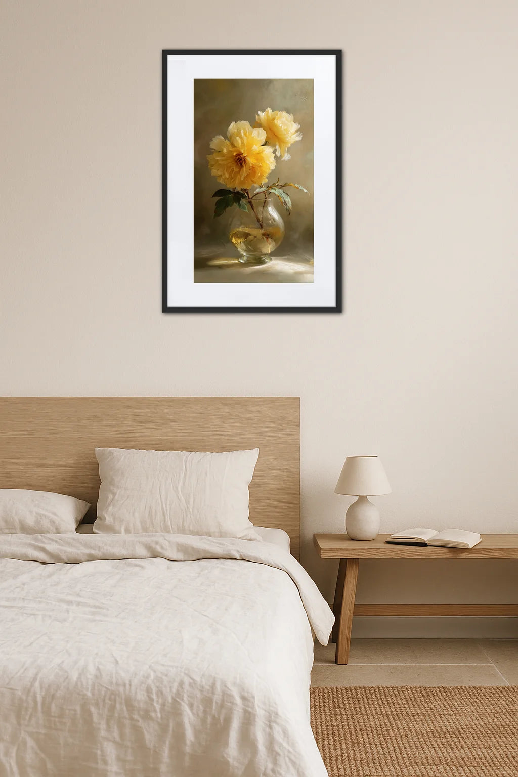 Ce tableau, d’une délicatesse rare, invite à un voyage intérieur où la nature se fait muse et confidente. Les fleurs jaunes, éclatantes mais pourtant douces, s’élèvent avec une grâce fluide, comme un hommage à la lumière qui caresse la matière. Le fond, subtilement travaillé, évoque une atmosphère feutrée, presque intemporelle, où chaque nuance semble respirer en harmonie avec les formes. L’œuvre transpose avec finesse l’énergie vibrante et chaleureuse du jaune, couleur de la joie et de la créativité, tout en conservant une élégance presque classique. L’association de cette iconographie détournée — où la fleur n’est plus simple ornement mais véritable sujet d’émotion — crée un dialogue entre tradition et modernité, entre le tangible et le rêve. Ce tableau est une invitation à redécouvrir la beauté dans sa forme la plus pure, à ressentir la lumière comme un souffle vital qui anime chaque jour. En le contemplant, on se laisse porter par le frémissement des pétales, la transparence du verre, la douceur d’un instant suspendu, essentiel et précieux.