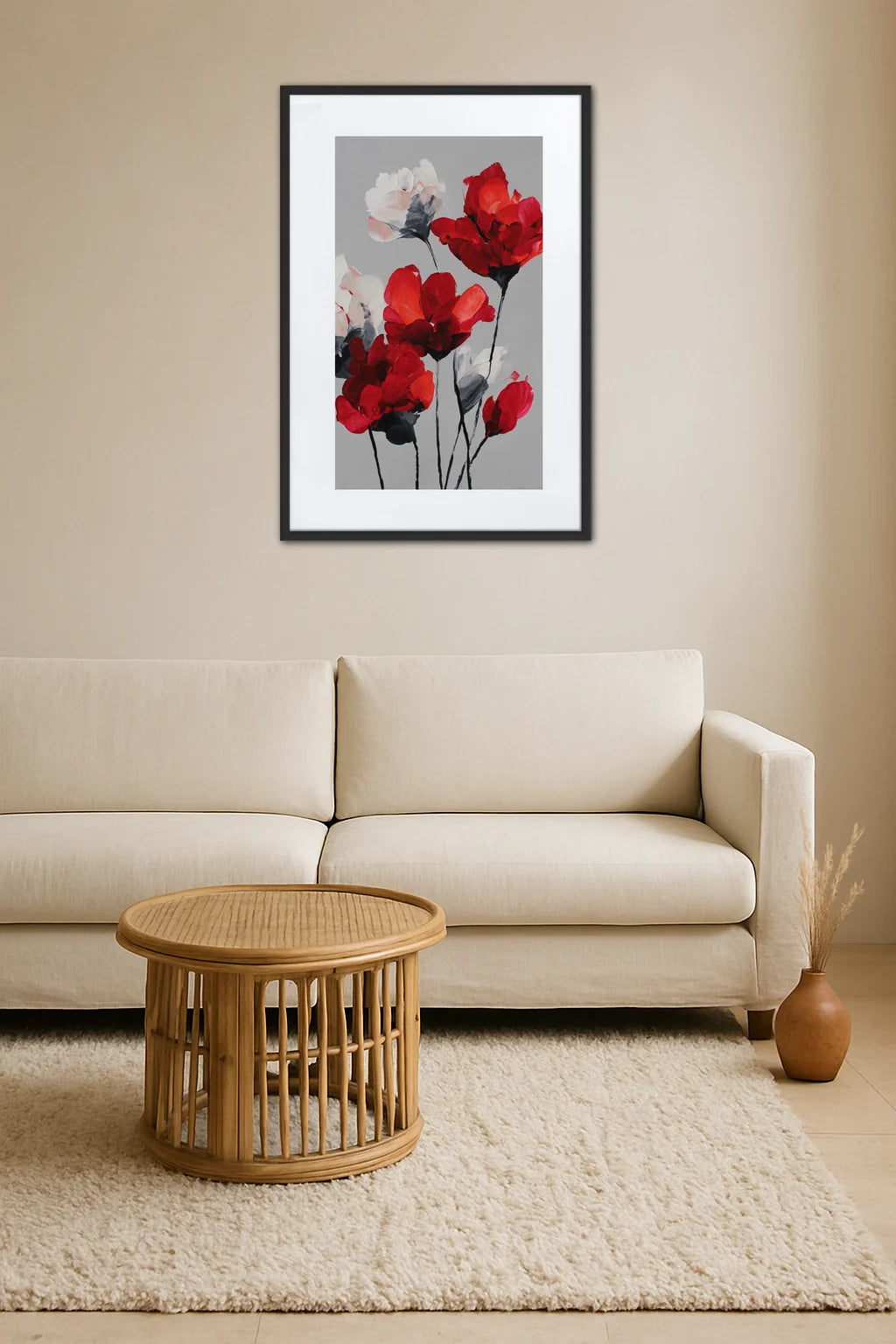 Ce tableau fleur original invite à un voyage au cœur d’une contemplation renouvelée, où la simplicité apparente des pétales se métamorphose en une danse passionnée de formes et de nuances. La composition s’appuie sur un contraste saisissant entre le fond neutre et la vivacité des fleurs rouges, comme un dialogue entre la sobriété et l’exubérance. Chaque coup de pinceau semble capturer un instant suspendu, un souffle de vie vibrant qui s'élève dans l’espace. Ce jeu subtil entre formes floues et contours affirmés évoque une modernité poétique, rappelant les mouvements artistiques qui ont su marier abstraction et figuration. Plus qu’une simple représentation florale, cette œuvre porte en elle l’énergie d’une nature réinventée, où la couleur devient une voix et la forme une émotion. Ce tableau célèbre l’éphémère tout en lui donnant une présence intemporelle, une signature visuelle qui transcende les saisons pour habiter durablement l’espace intérieur.