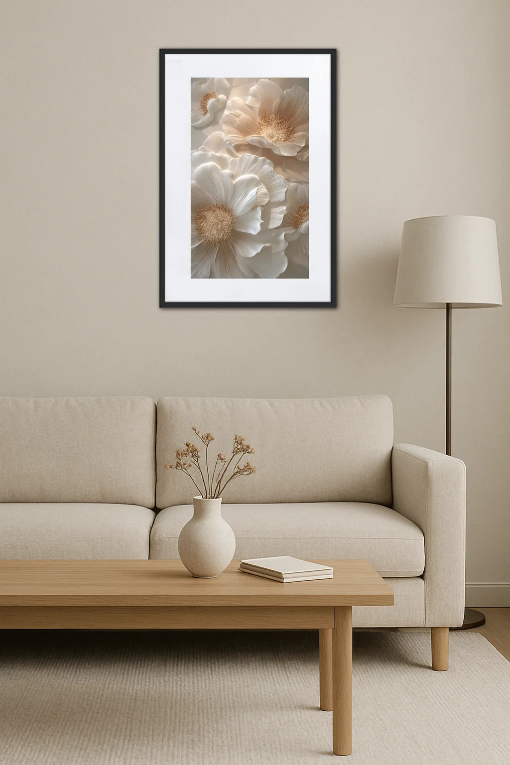 - Composition élégante : L’agencement fluide des fleurs donne vie à une danse silencieuse où chaque forme semble respirer. Cette élégance visuelle se traduit par une émotion douce, un équilibre parfait entre présence et délicatesse qui habille subtilement votre intérieur.