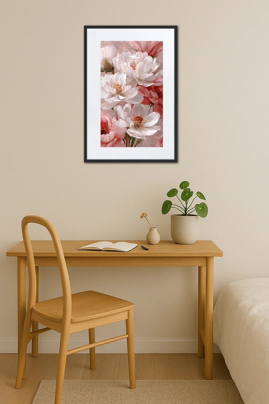 - Élégance visuelle : La pureté éclatante des fleurs blanches illumine la pièce, tandis que les nuances rosées apportent chaleur et profondeur. Ce contraste délicat invite à une sérénité contemplative, éveillant un sentiment de calme intérieur et d’harmonie.