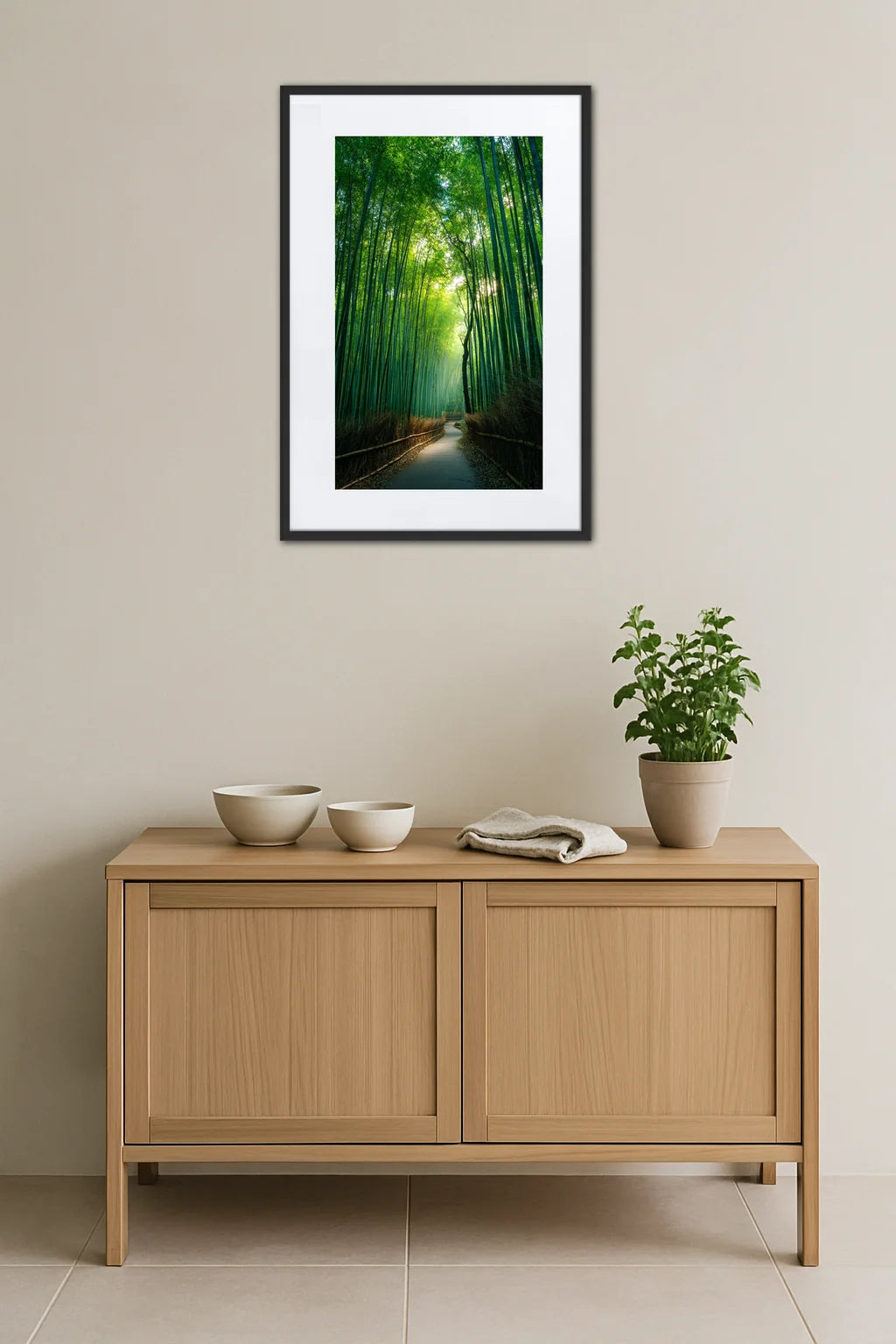 - Une lumière enveloppante : La clarté filtrée à travers les bambous éclaire le chemin avec une douceur naturelle, apportant une atmosphère apaisante. Ce jeu subtil invite à la sérénité et à l’évasion, pour une sensation de calme profond dans votre espace.