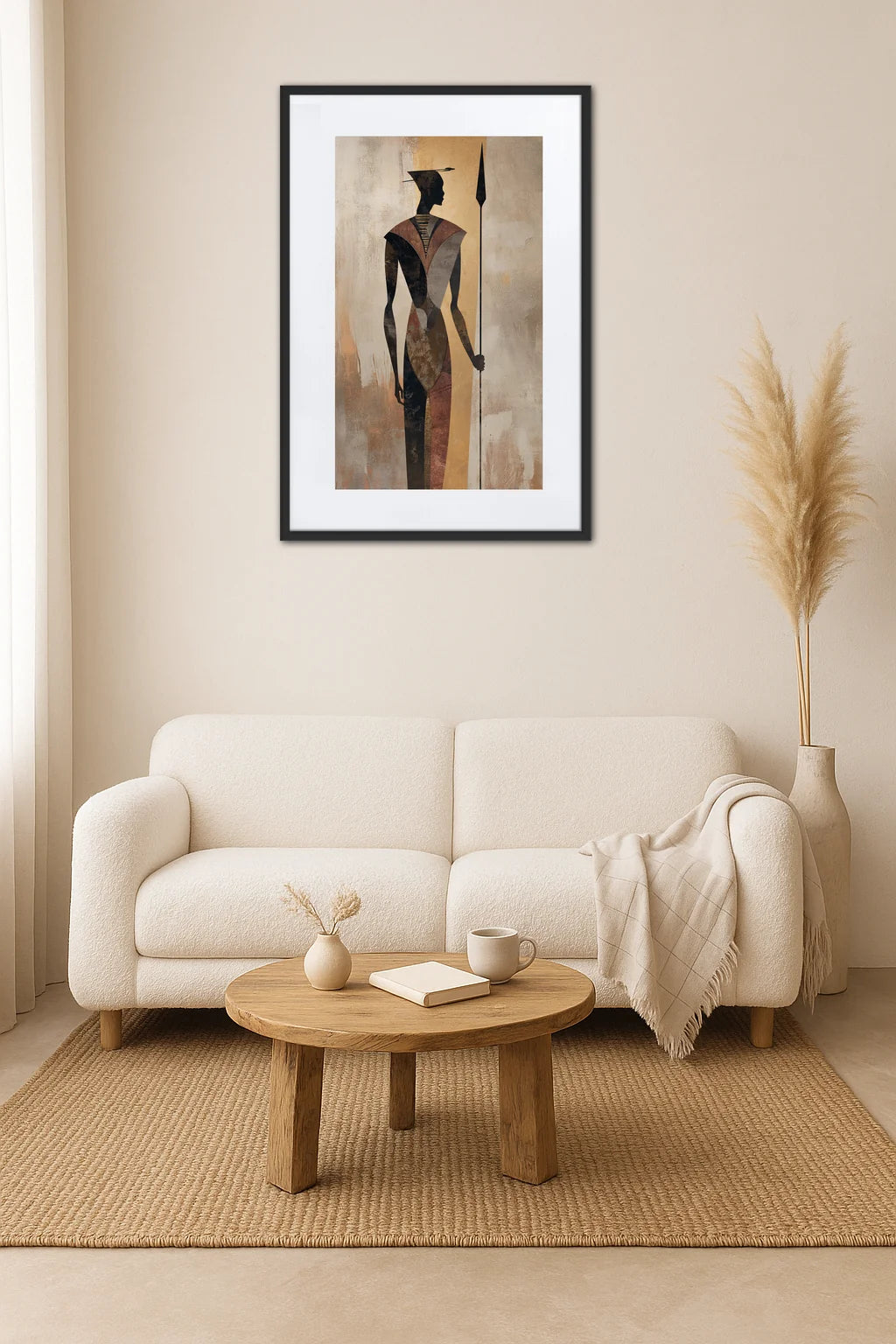 Dans ce tableau, le guerrier africain se dresse, à la fois gardien des traditions et figure intemporelle de résilience. Sa forme élancée, presque abstraite, évoque la puissance tranquille d'un protecteur ancestral, porteur d’une histoire riche et complexe. Le jeu des formes et des nuances traduit la diversité culturelle et spirituelle des terres africaines, où chaque geste, chaque arme, chaque posture raconte un récit millénaire. La lance qu’il tient est plus qu’une arme, elle est le lien entre l’homme et sa terre, symbole de courage et d’honneur. Le fond aux teintes douces et terreuses enveloppe la silhouette d’une atmosphère presque onirique, suspendue entre légende et réalité. Cette œuvre invite à la méditation sur la force intérieure et la beauté profonde des cultures africaines, tout en offrant une interprétation moderne et raffinée qui transcende les frontières. Le tableau devient ainsi un hommage vibrant, une célébration silencieuse de l’identité et de la mémoire collective, à la fois ancrée dans ses racines et ouverte au regard contemporain.