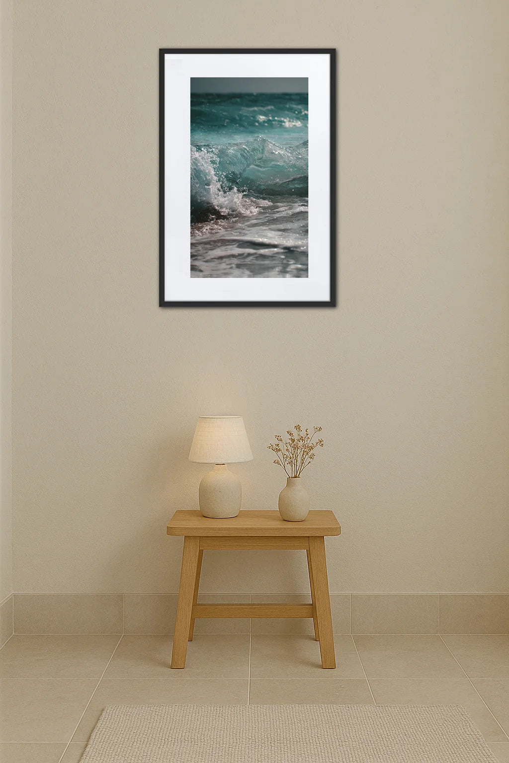 - Le mouvement perpétuel : Chaque détail de l’écume en suspension suggère un instant figé dans le flux continu de la mer. Cette impression de mouvement invite à une contemplation apaisante, comme un souffle de liberté qui traverse la pièce.
